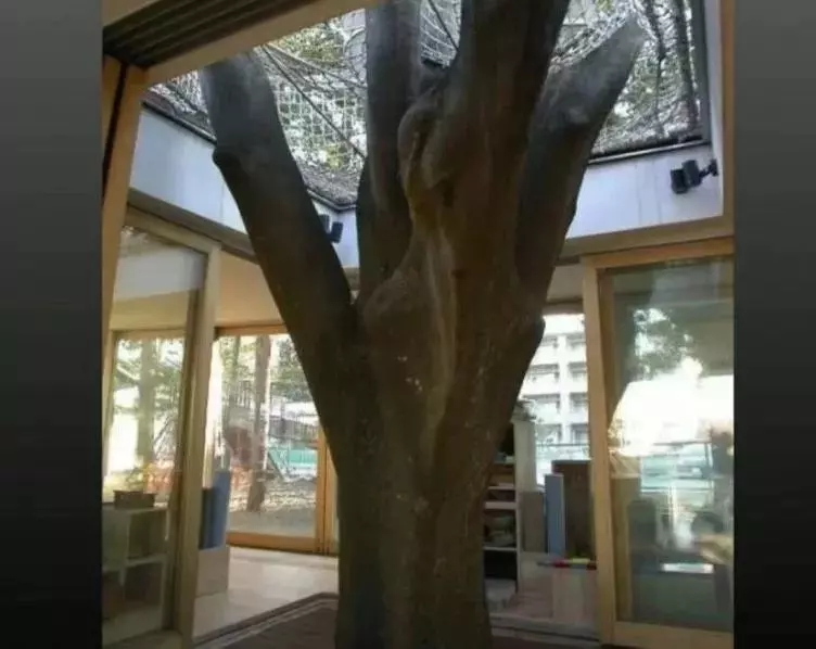 你看,一棵樹從地下貫穿教室,一直長到屋頂外面。