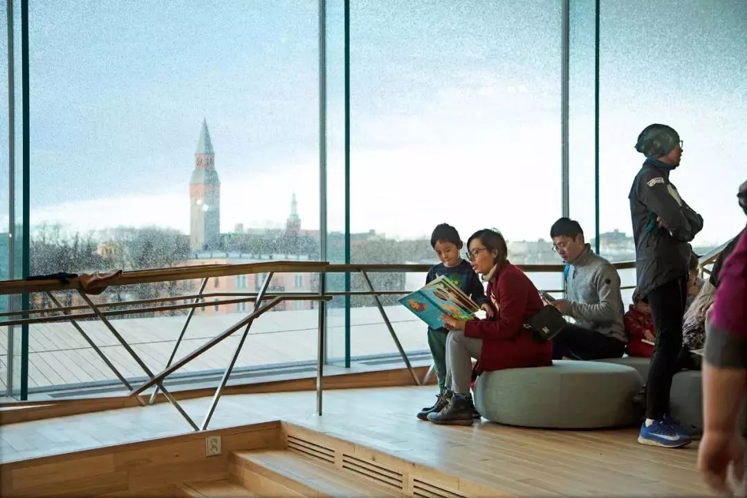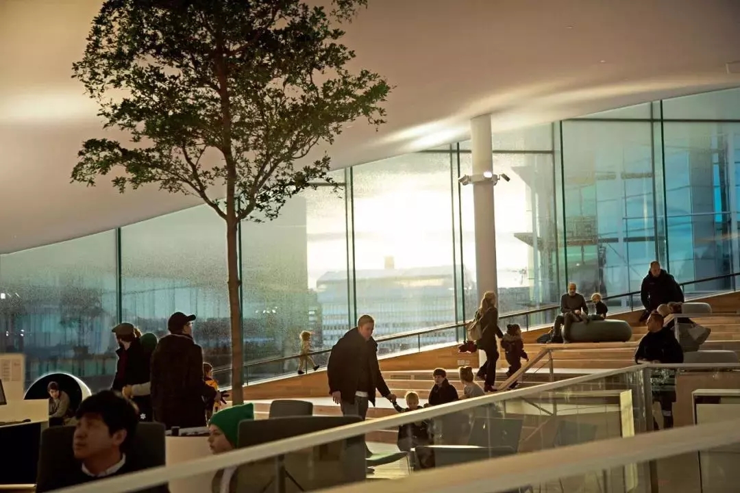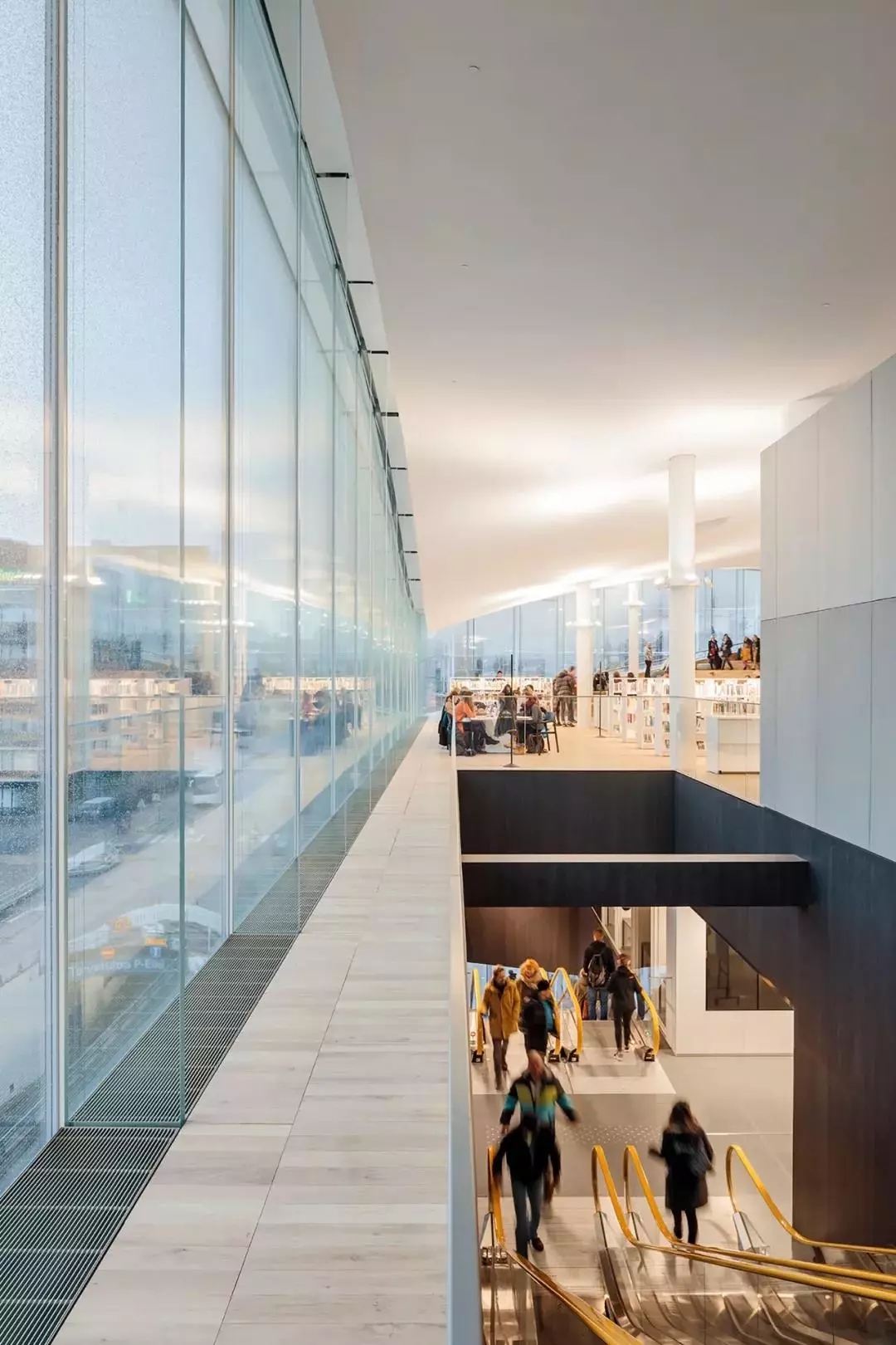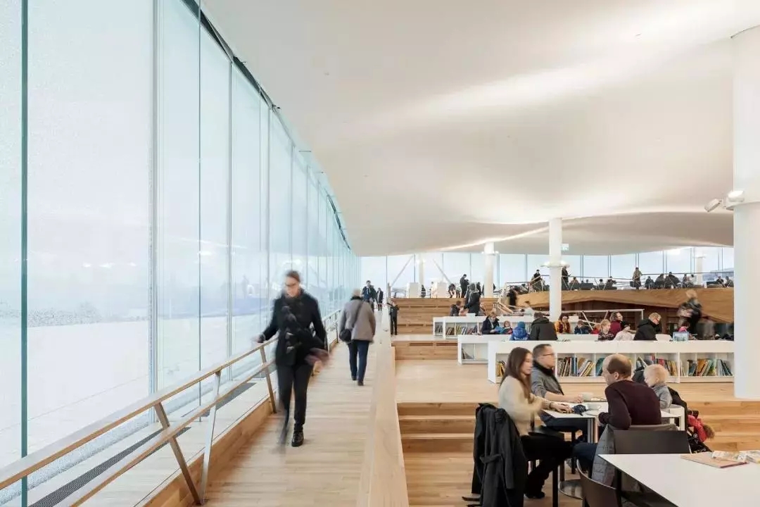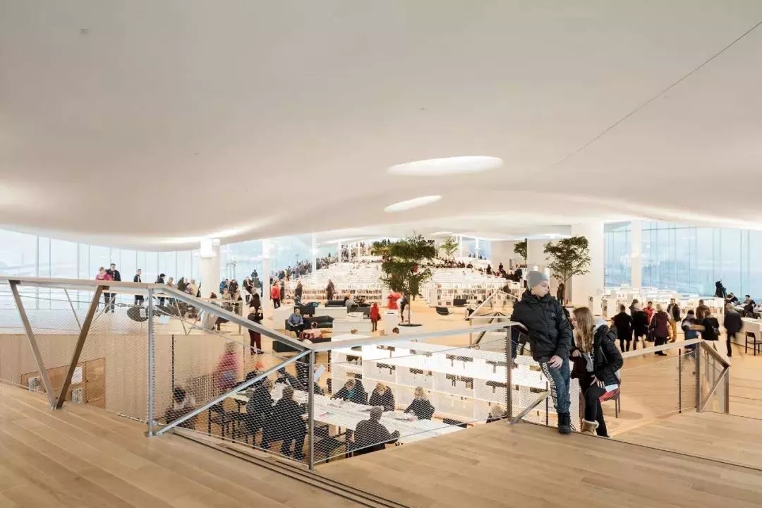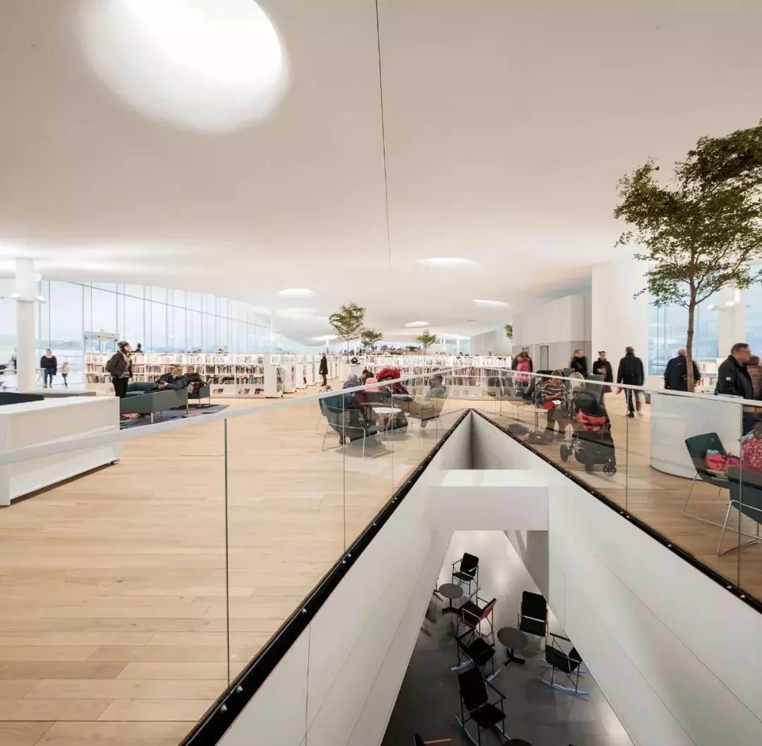 橋的上端所支撐的,被建筑師稱為“亭子”的,就是頂層“書的天堂”。周邊全部玻璃墻圍住,似乎懸空于橋上。充分利用自然采光,這在北歐冬季,日照極為短暫的天況下,顯得尤為重要。