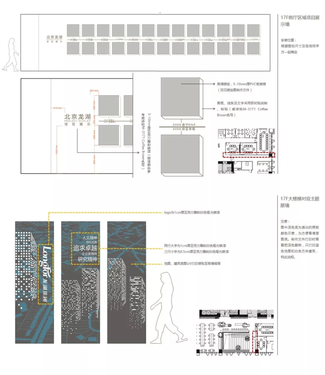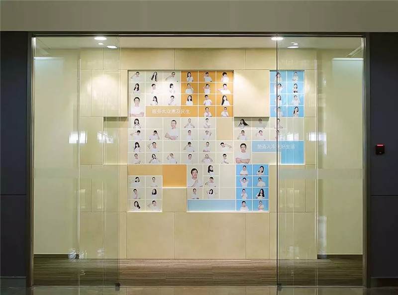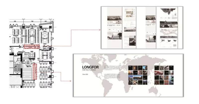 這一部分內(nèi)容跟展示設(shè)計(jì)相似,例如上圖,龍湖集團(tuán)辦公室內(nèi)的一些項(xiàng)目展示團(tuán)隊(duì)的建設(shè),利用了大面積墻面上的空間進(jìn)行了設(shè)計(jì)和制作。