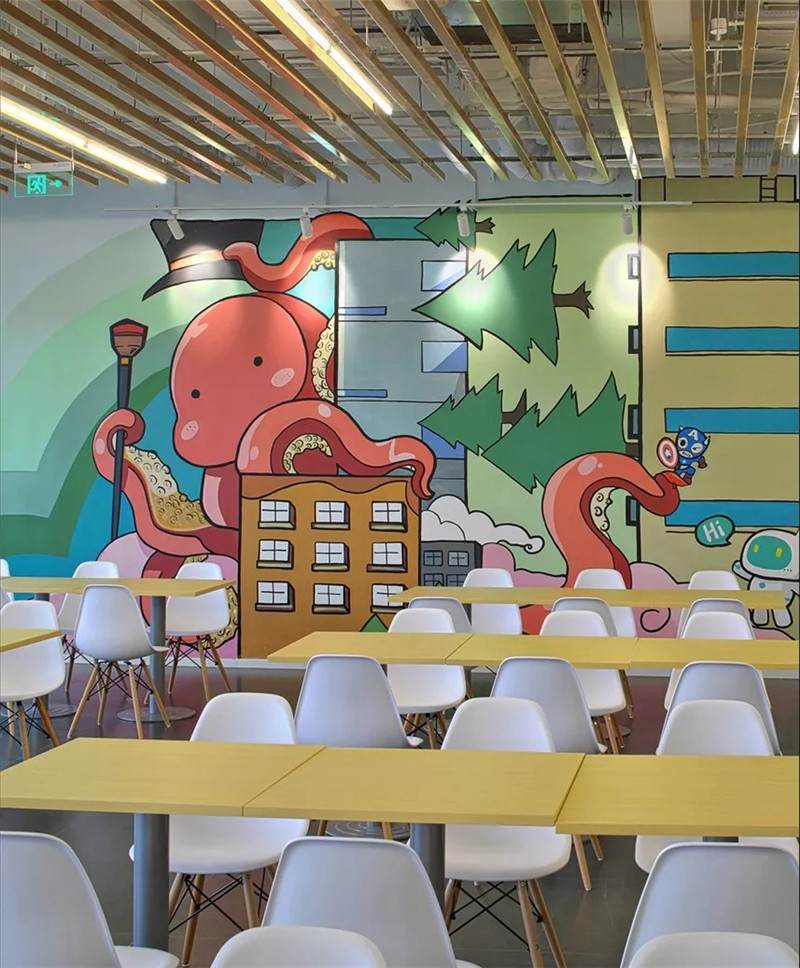 空間氛圍不同,所以圖形裝飾也會(huì)因地制宜的改變,用暖色更動(dòng)態(tài)的感覺。繪制的粉筆畫,可以定期的更換,像黑板報(bào)一樣制定不同的主題,它就是一面活的展示墻。