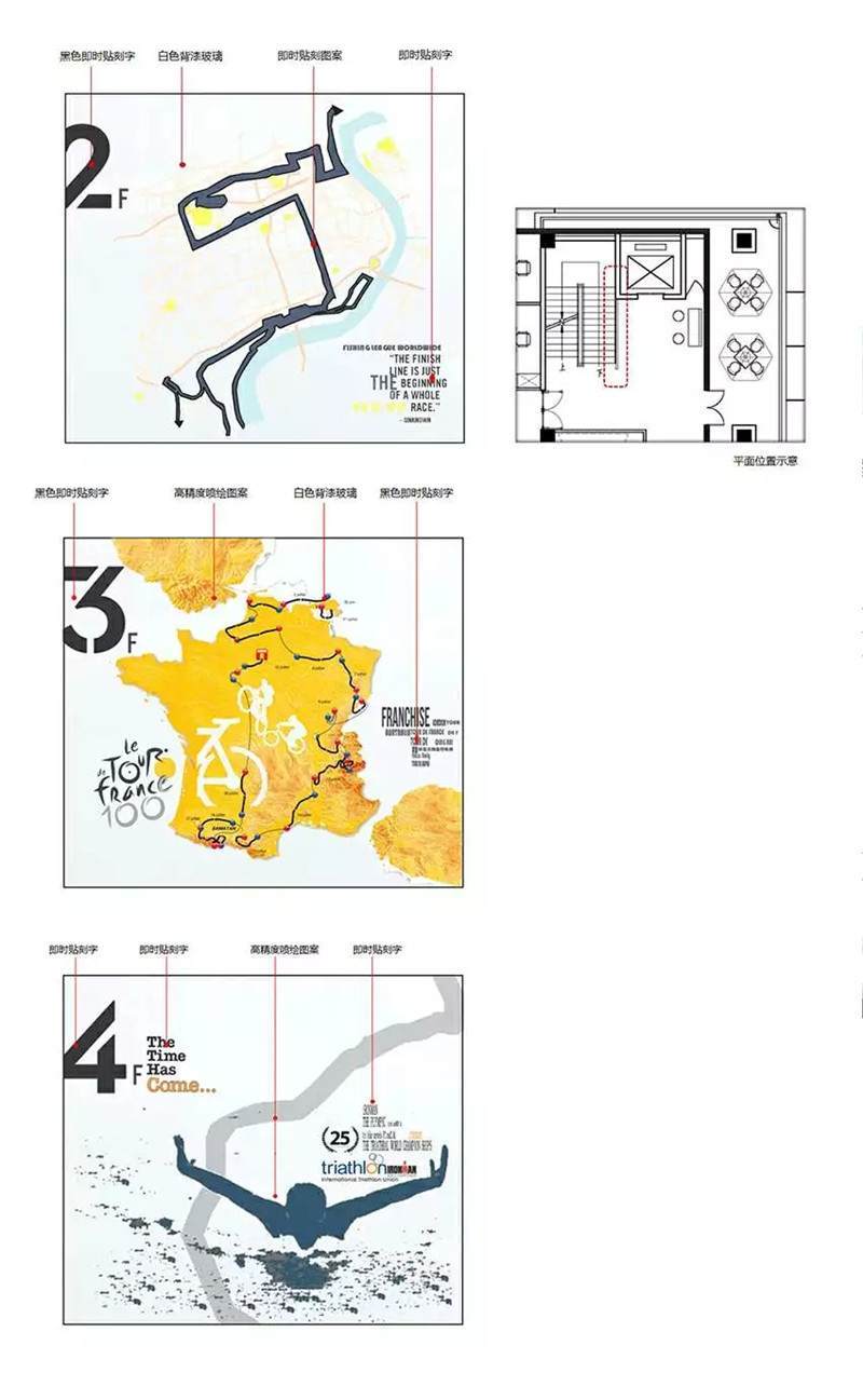 軟裝部分,這是幾層的設(shè)計(jì)稿,不同樓層的導(dǎo)視結(jié)合圖案以及主要的背景墻的主題。當(dāng)時(shí)的設(shè)計(jì)文件實(shí)際的完成效果可以看出跟之前的設(shè)計(jì)稿基本上是完全一樣的,設(shè)計(jì)的時(shí)候也是因?yàn)槎际怯玫氖噶课募?:1的設(shè)計(jì)小稿,所以能保證完成后的效果。