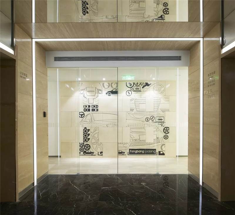 因?yàn)轫?xiàng)目在北京,所以選取北京有代表性的建筑剪影組合在一起,形成了貼膜圖案。實(shí)際實(shí)施完以后,燈光打亮的情況下,地圖相當(dāng)于有不同細(xì)度的鏤空線條,非常清晰,包括建筑的剪影也十分細(xì)致,既起到了一定的私密性,又有非常強(qiáng)的視覺效果。