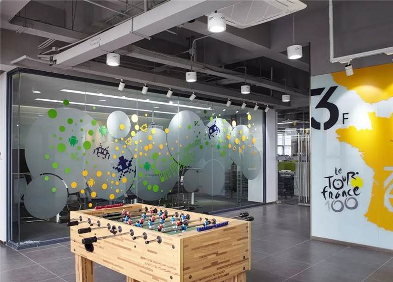 第二張中可以看到,桌上足球,這一張是會(huì)議室的玻璃貼膜,最初設(shè)計(jì)的都是一些彩色的圓點(diǎn),但是做完后太通透,起不到遮擋作用,所以現(xiàn)場(chǎng)臨時(shí)在玻璃的內(nèi)側(cè)又加了大型的磨砂圓,就有兩層疊加到一起的圖形,磨砂與色彩組合在一起,效果豐富有層次。