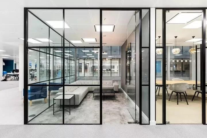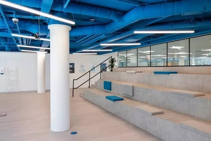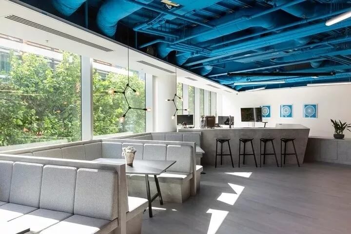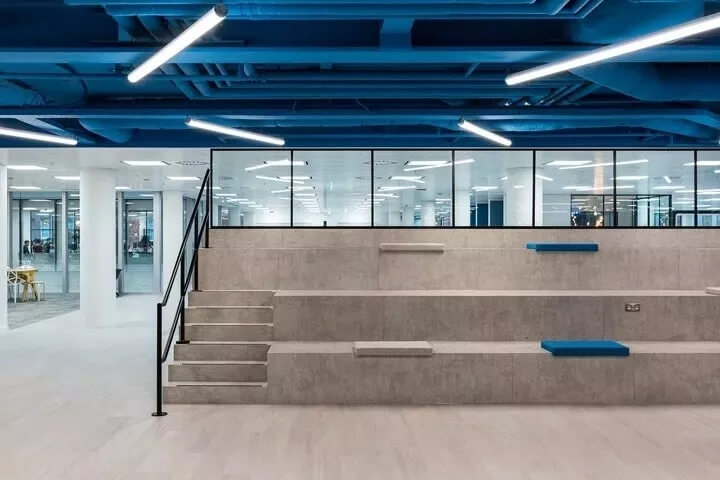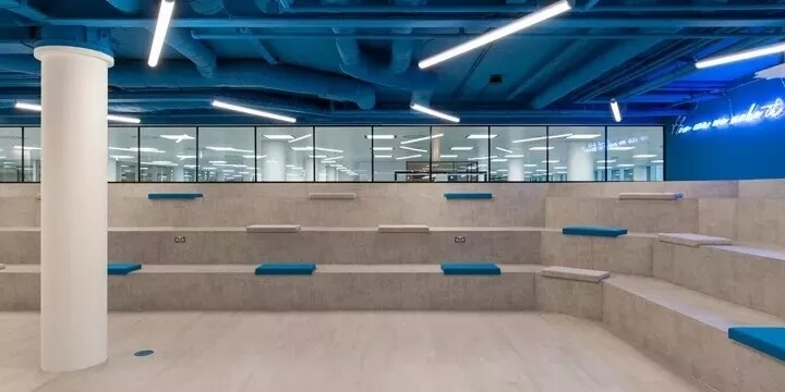 特點:科技,總部、英國、斯堪的納維亞設(shè)計風(fēng)、寧靜自然簡約、灰色、藍色頂面、水泥質(zhì)感、看臺式階梯座、車廂座、玻璃隔斷
