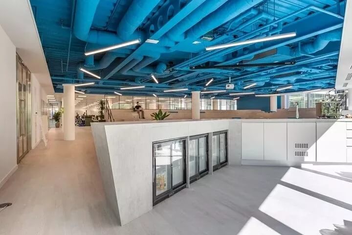 本案最令人贊嘆的創(chuàng)意構(gòu)思是與接待區(qū)相連的休閑區(qū)的藍色頂面設(shè)計,藍色是公司的標識色,除了這里也點綴于會議空間和靈動的工作區(qū)。裸露的頂面和設(shè)備管道都統(tǒng)一在純凈的藍色之中。這里不僅用于接待訪客同時也是大型集會、交流協(xié)作和派對活動之地。