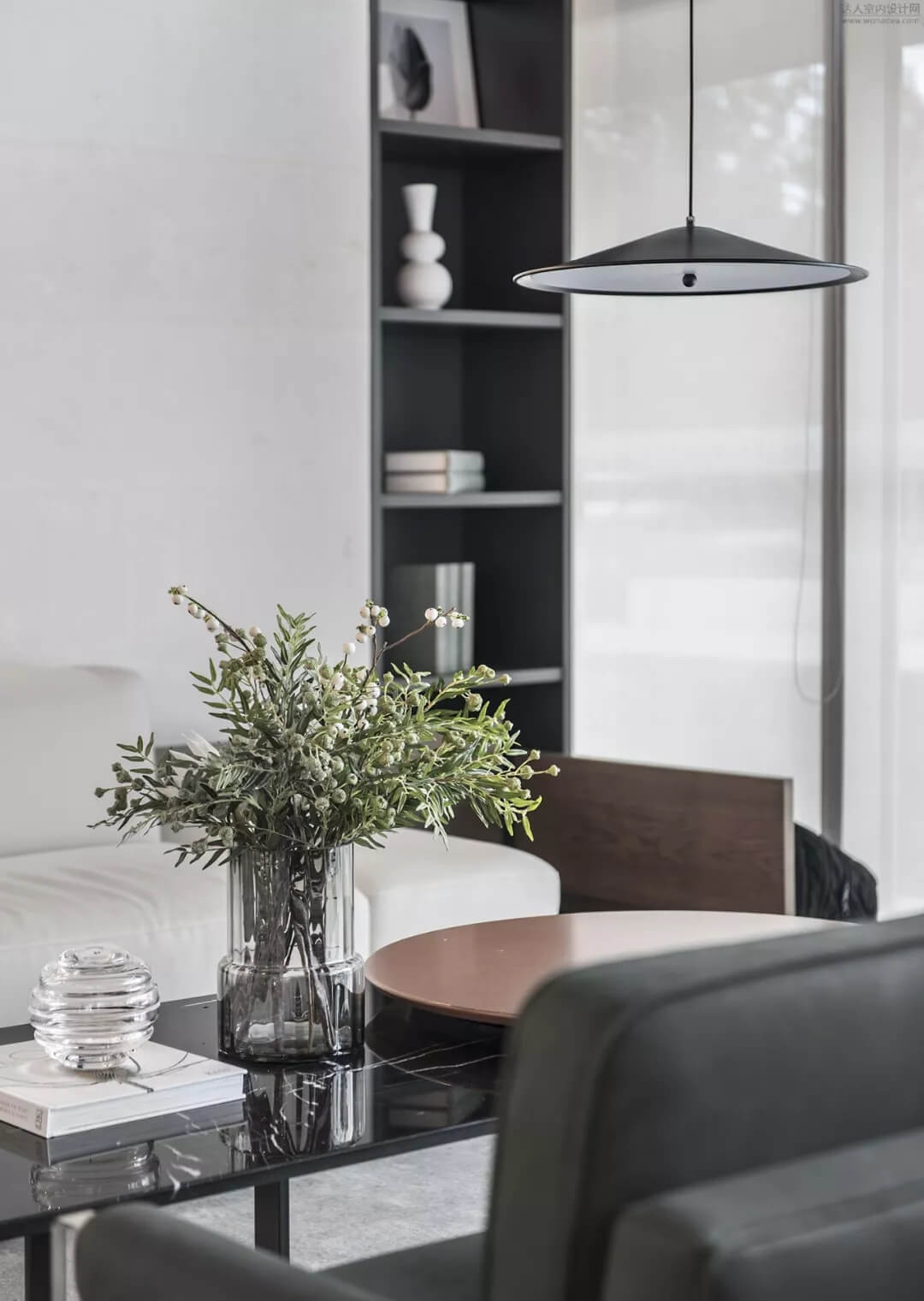 尊重木質(zhì)的肌理美感,熟諳工藝,亞克力材質(zhì)包裹的木質(zhì)年輪,如同凍結(jié)了時間的流逝,守住這一刻的永恒。簡潔的質(zhì)感綠色皮質(zhì)沙發(fā)予以低調(diào)的奢華,同色系的植被增加了空間層次感。