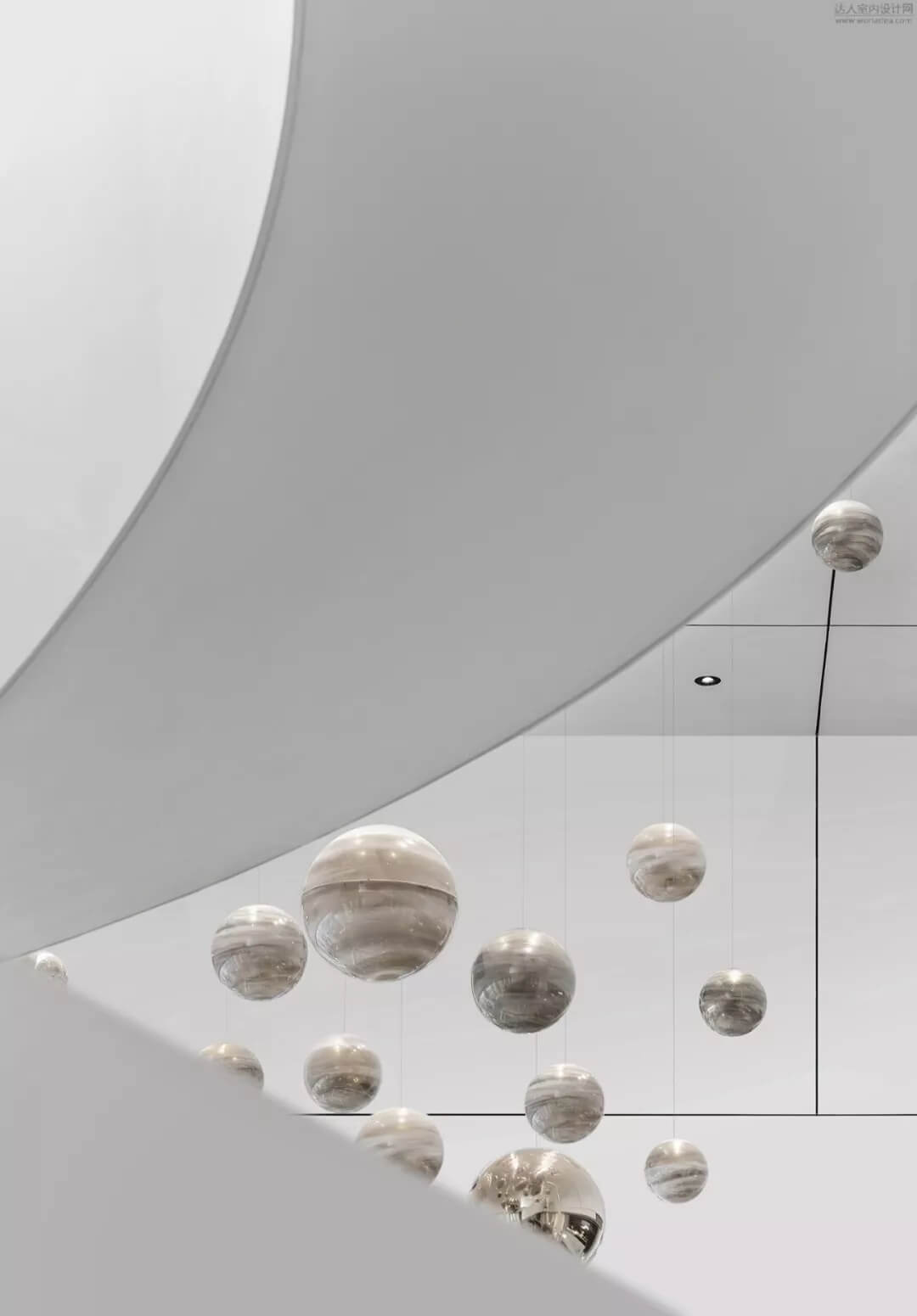 以和諧地球為理念展開的設計元素,售樓處上方錯落有致、大小不同的球體精致的點綴著空間,紋理折射光線,以靜止狀態(tài)演繹動態(tài)。