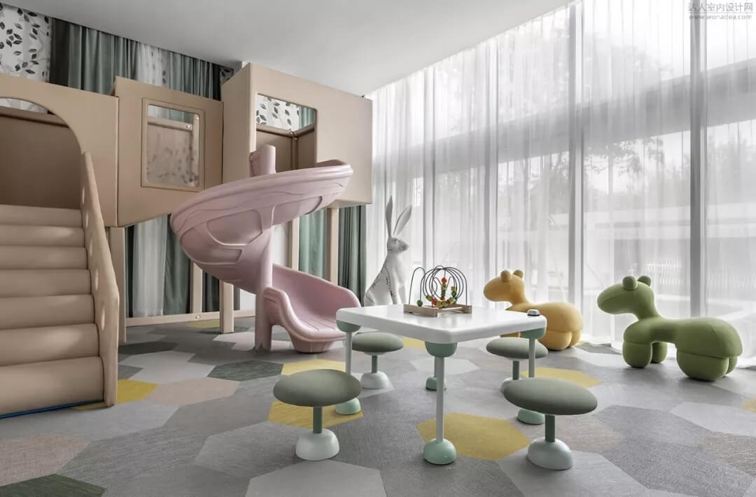 兒童區(qū)曼妙著森林深處的味道,暖暖的顏色彩散發(fā)著與自然 ,生命,和平共處的氣息,玻璃的陽光開放式結(jié)構(gòu),智慧的精靈無處不在,響應著空間的靈動氣息。