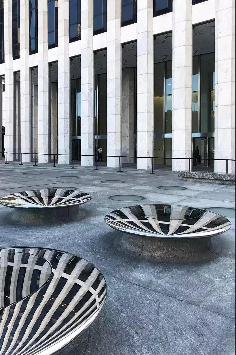 它們無縫的曲面造型讓人們既能坐在上面休息,又能在鏡中看到反射的城市建筑。