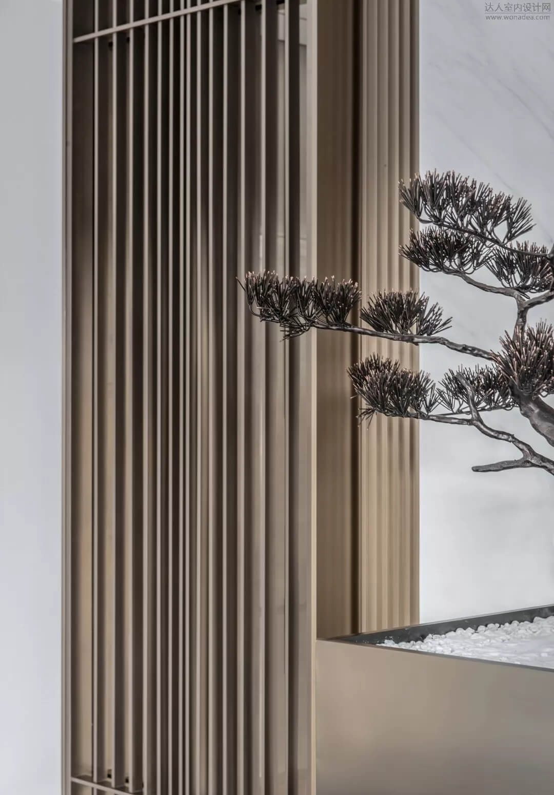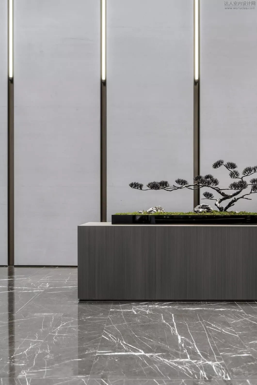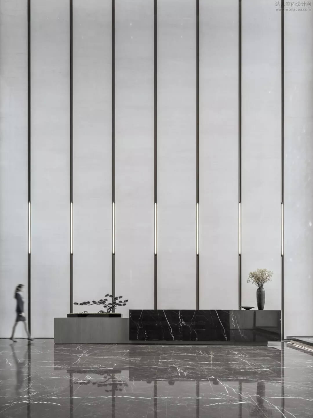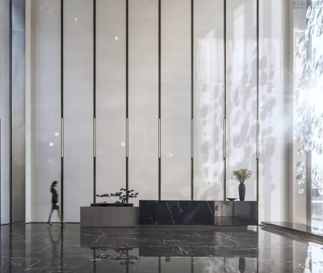 通過豐富的景觀區(qū)進(jìn)入門廳,感受到空間的空靈,立面設(shè)計(jì)過濾了來自于外界的繁復(fù)。十米挑空的大廳,墻面以米色砂巖為基底,黃銅色金屬強(qiáng)化縱向的比例,凸顯出空間的氣勢。入口對景設(shè)置的水景讓穿梭其中的訪客仿若能傾聽到潺潺水聲,同時(shí)水景和懸掛的軟裝裝置相得益彰,充滿巧妙的用意,同時(shí)也分隔了挑高通透的玻璃幕墻,虛實(shí)結(jié)合,體現(xiàn)現(xiàn)代設(shè)計(jì)的東方神韻。