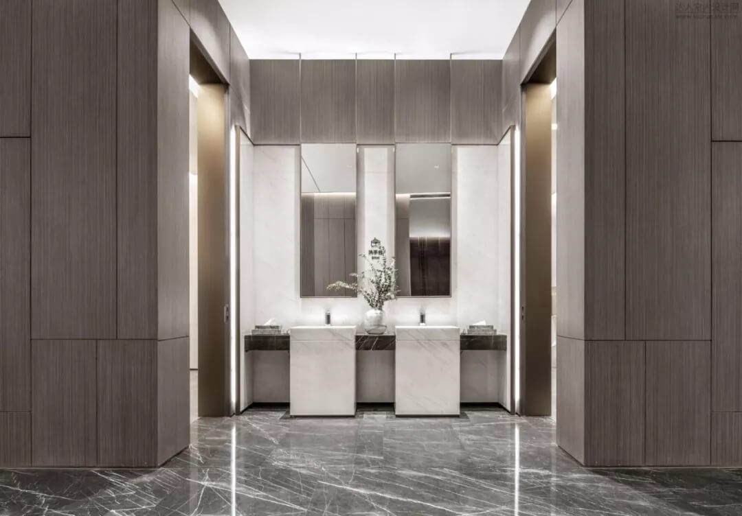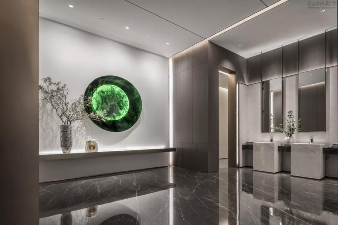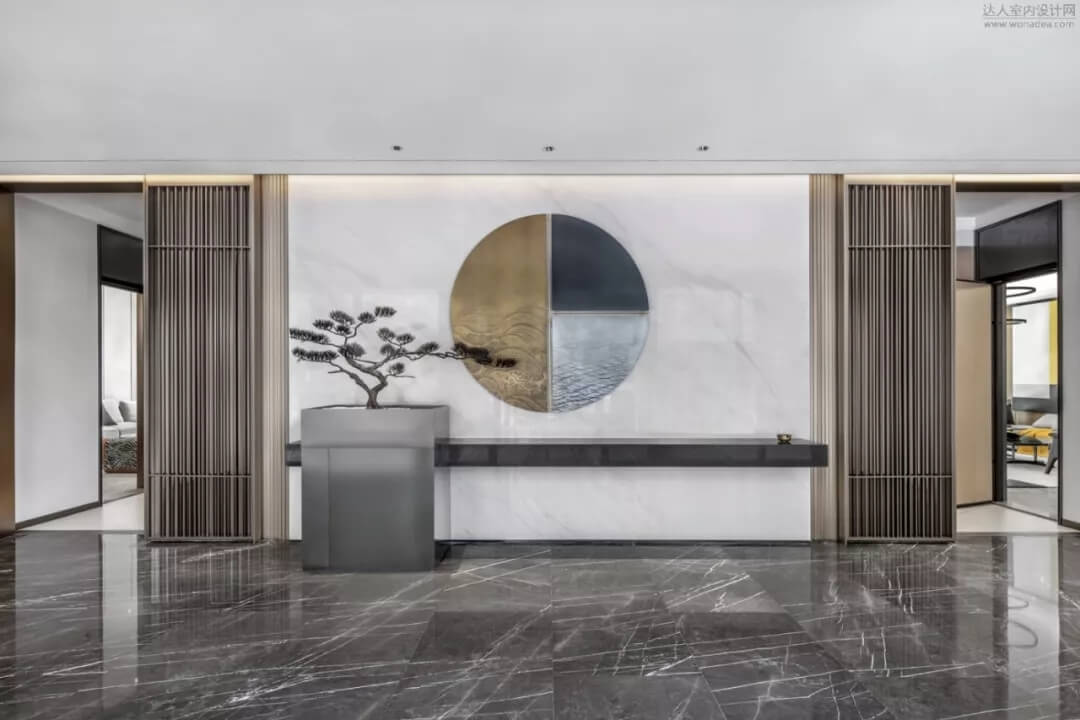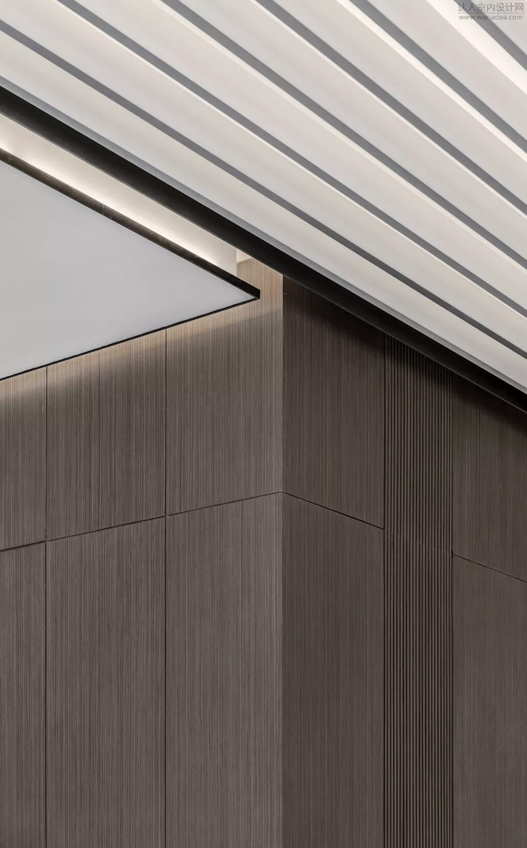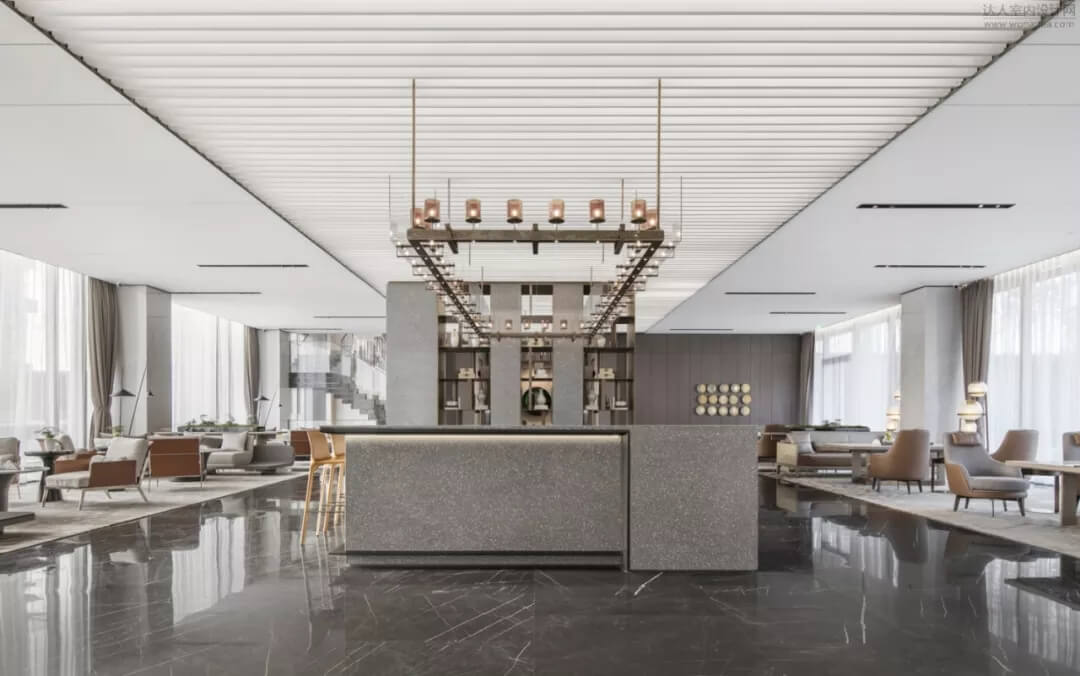 通過豐富的景觀區(qū)進(jìn)入門廳,感受到空間的空靈,立面設(shè)計(jì)過濾了來自于外界的繁復(fù)。十米挑空的大廳,墻面以米色砂巖為基底,黃銅色金屬強(qiáng)化縱向的比例,凸顯出空間的氣勢。入口對景設(shè)置的水景讓穿梭其中的訪客仿若能傾聽到潺潺水聲,同時(shí)水景和懸掛的軟裝裝置相得益彰,充滿巧妙的用意,同時(shí)也分隔了挑高通透的玻璃幕墻,虛實(shí)結(jié)合,體現(xiàn)現(xiàn)代設(shè)計(jì)的東方神韻。