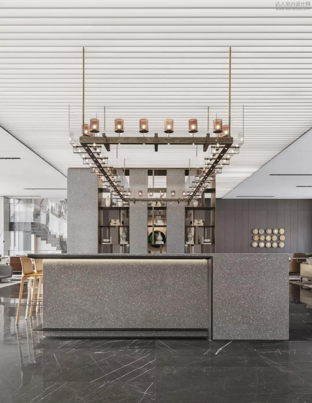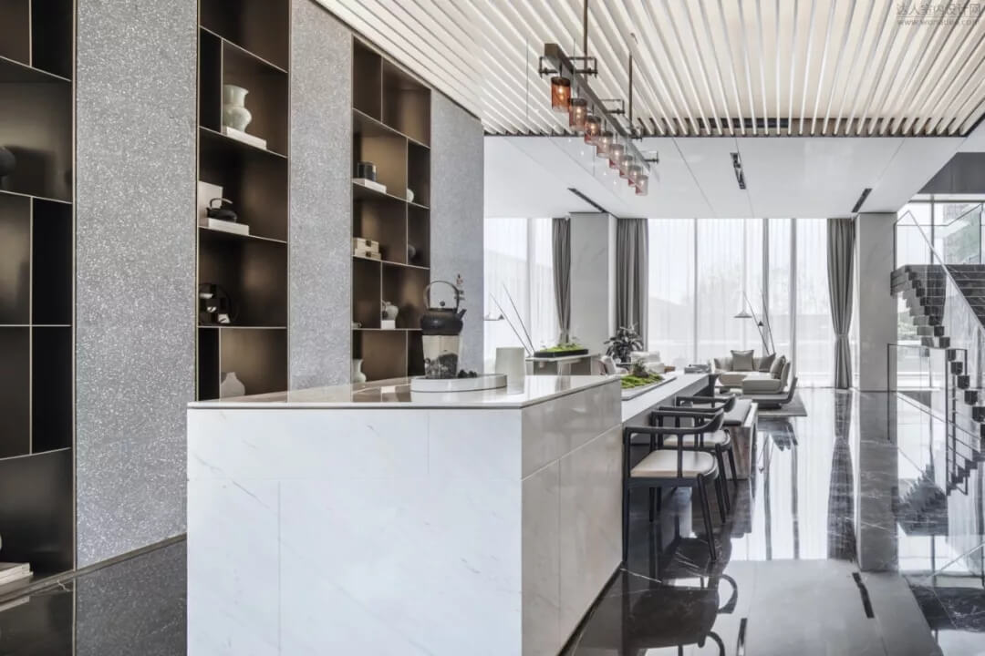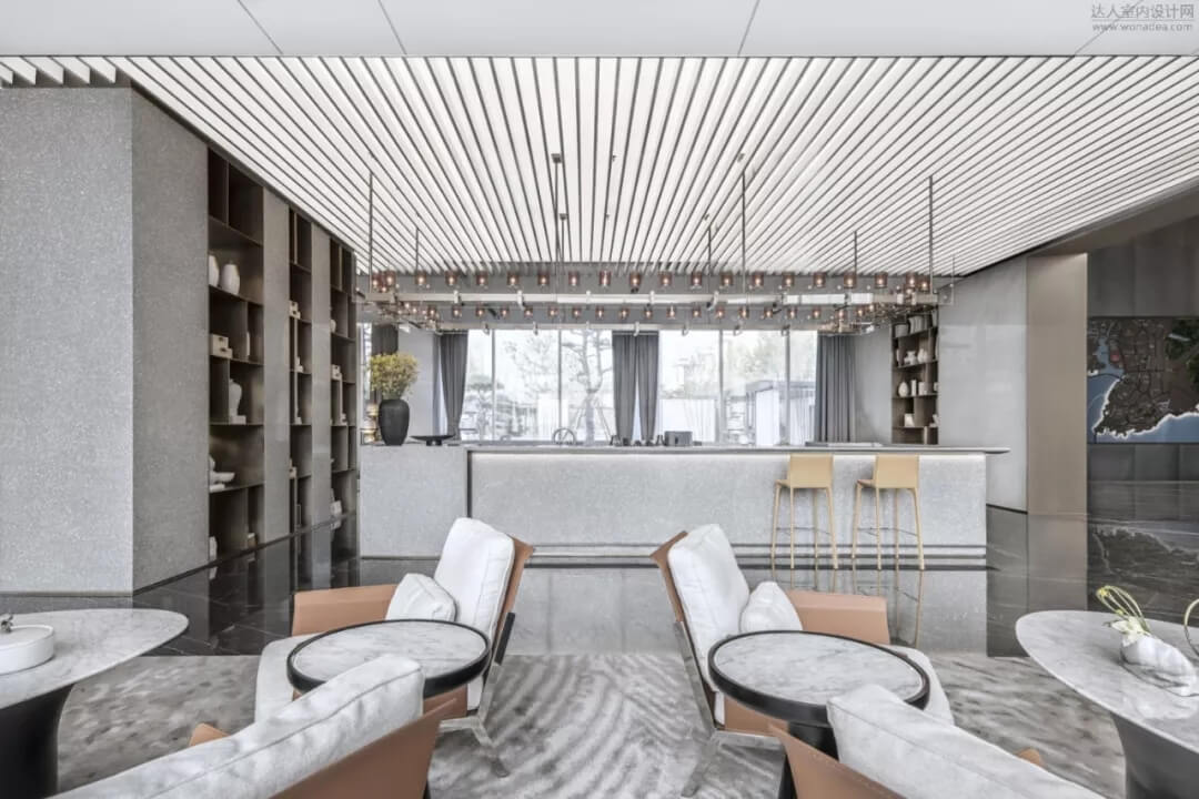 進(jìn)入洽談區(qū)大廳,通過大面積全明落地玻璃窗,最大程度地將室外的建筑、景觀效果納入室內(nèi)視野,以觀景式空間概念記錄時(shí)移景易的歲月縮影。圍合形的水磨石吧臺猶如藝術(shù)裝置,成為空間的中心焦點(diǎn)。