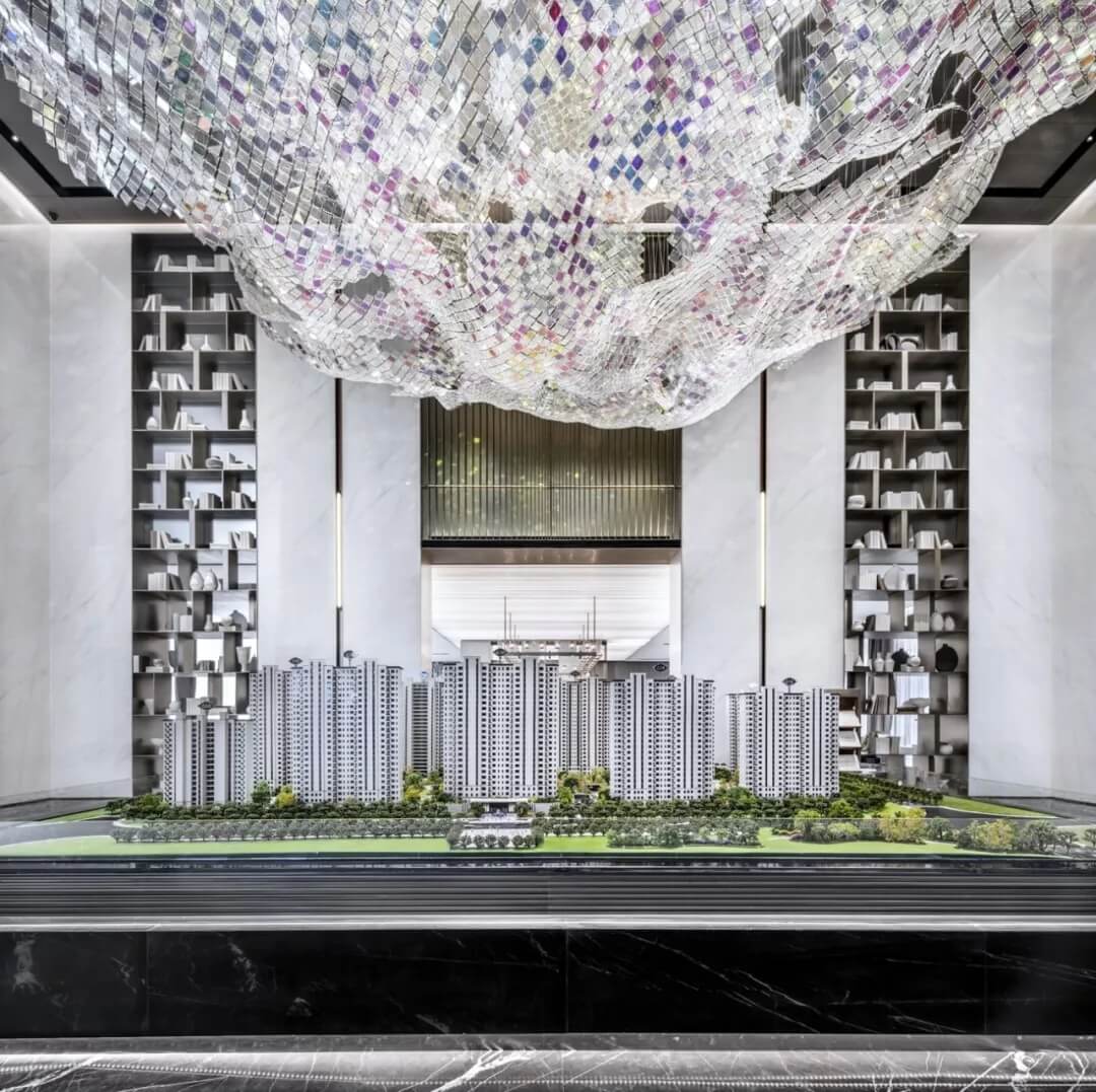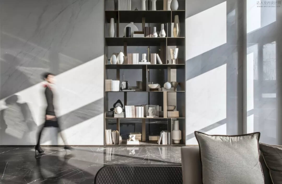 沙盤區(qū)墻面以大花白陶瓷板為主墻面,通過通高的黃銅書架體塊和金屬格柵,本身空間具有很強(qiáng)的中軸對稱的儀式感,凸顯出空間的大氣。曼妙的波浪曲線,以流動(dòng)的韻律打破空間靜態(tài),同時(shí)從明亮空靈的大堂走入半圍合的沙盤區(qū),總能給人帶來新奇感,亦是詩意與藝術(shù)的格調(diào)升華。