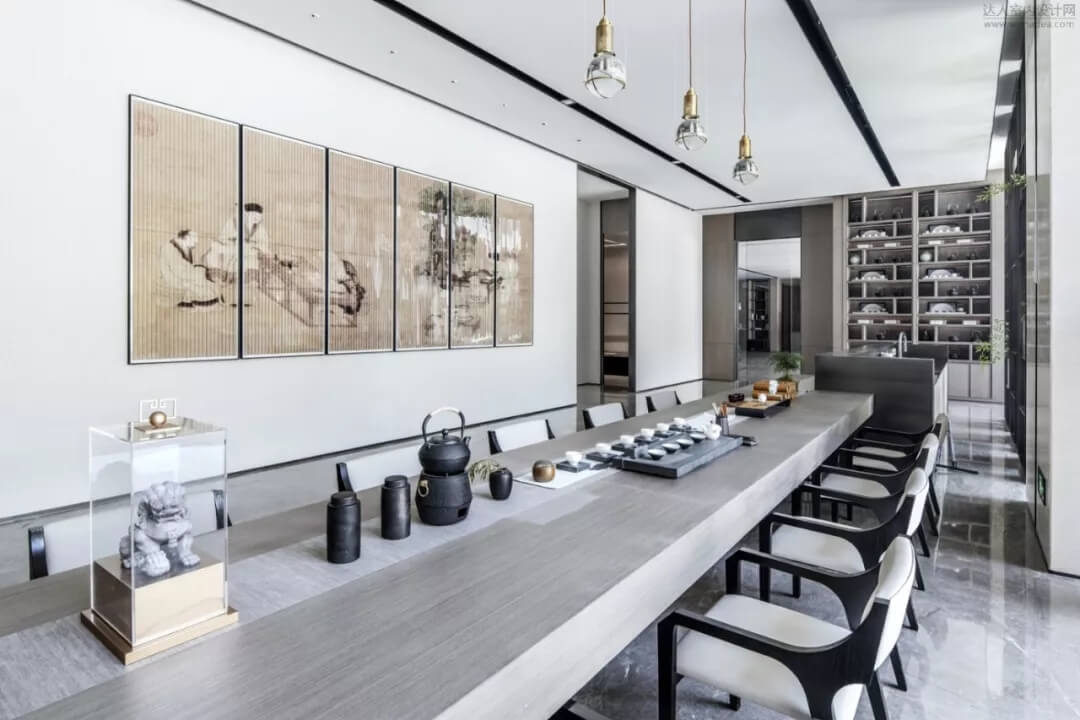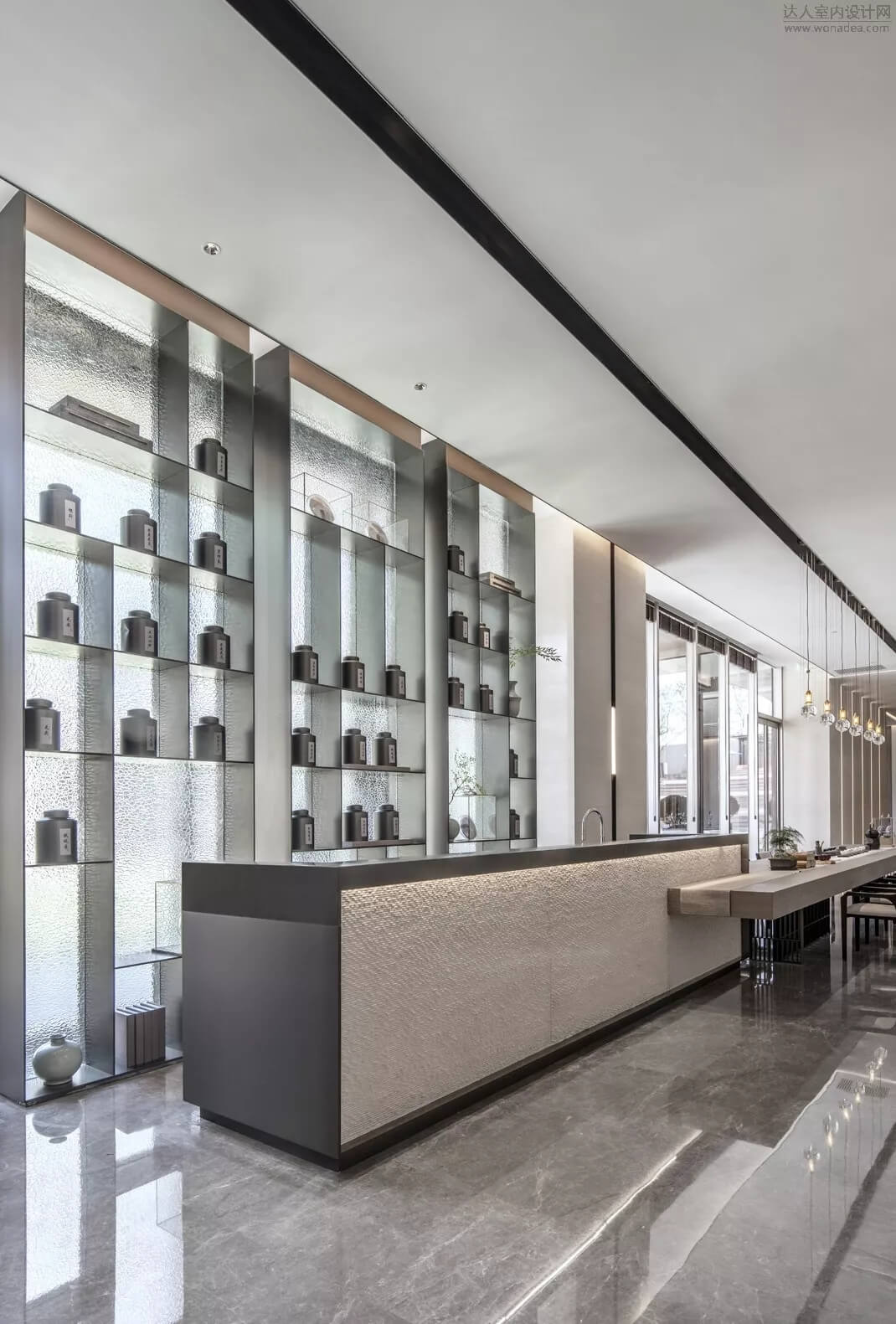 在會(huì)所品茶水吧臺區(qū)結(jié)合枯山水造景,色彩雅致內(nèi)斂,充分展現(xiàn)了中國人素來喜愛的‘靜’,同時(shí)超長條的品茶臺,利用下沉庭院的景觀和室內(nèi)產(chǎn)生了互動(dòng),模糊了室內(nèi)外的界限。藝術(shù)儀式感的空間給人帶來思考的余地。