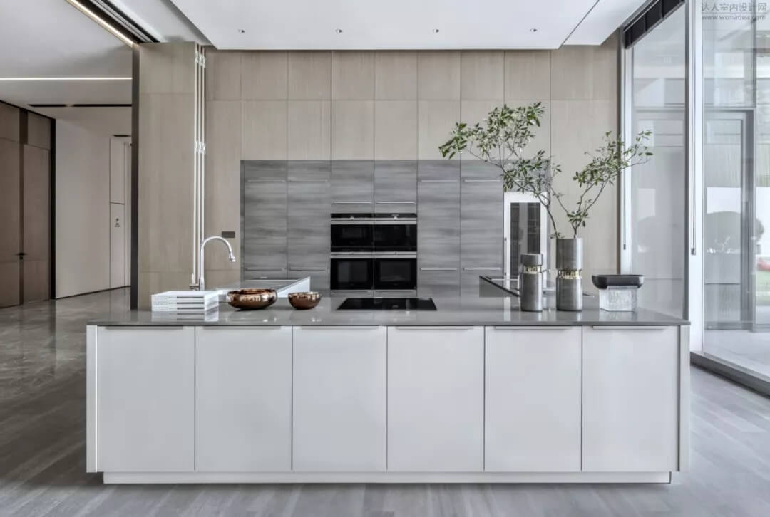 私宴,是以當(dāng)代設(shè)計(jì)來描繪文人飲酒時(shí)追求的清雅意境,寄情於山水。空間通過折疊門和西廚吧臺區(qū)產(chǎn)生互動(dòng),空間功能既獨(dú)立又有相互滲透。延續(xù)簡潔流暢的線條,布置與空間密切配合。