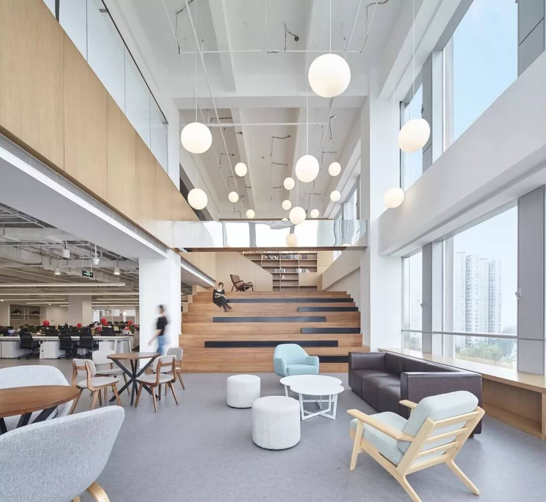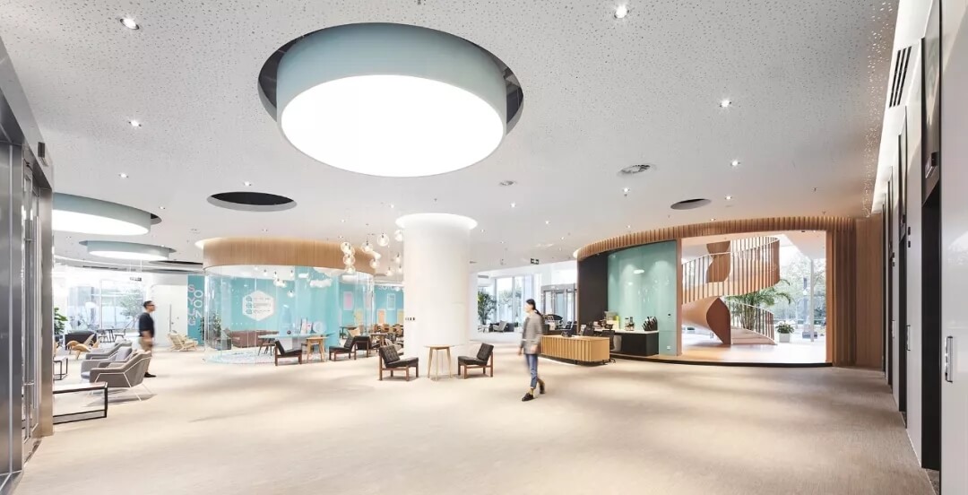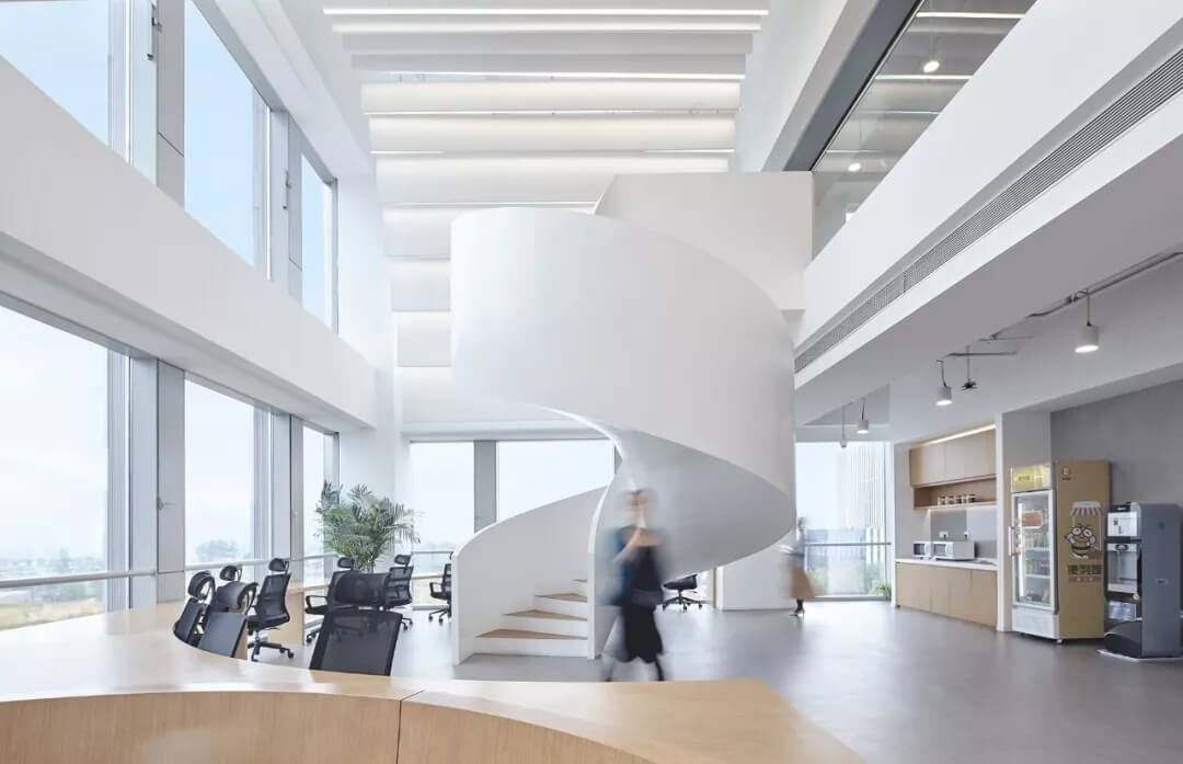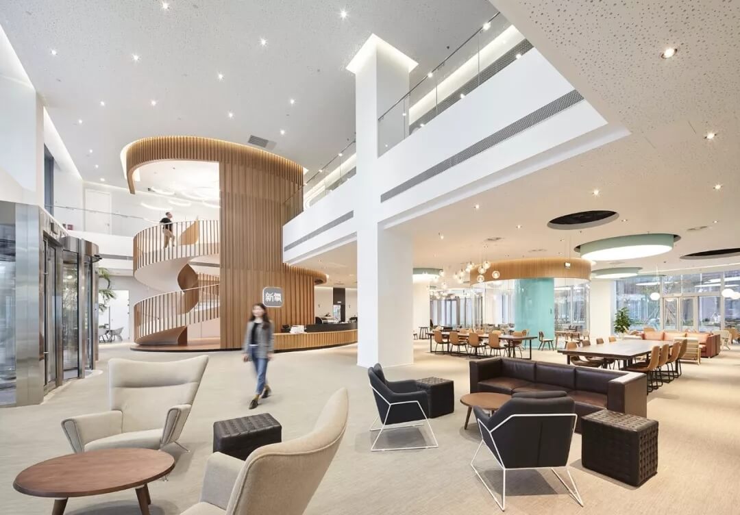 都市客廳島,選擇流暢線條的螺旋樓梯貫穿上下,運用條形面板錯縫排列成弧形的照明方式,使整個空間照度均勻,且條形面板亦可作為裝飾展示面。家居軟裝選用極簡風格,流線組擺方式,營造自由靈活的空間,促進員工間的交流和溝通。
