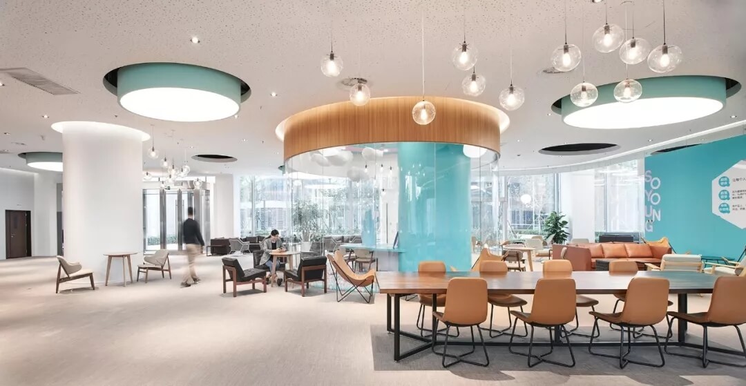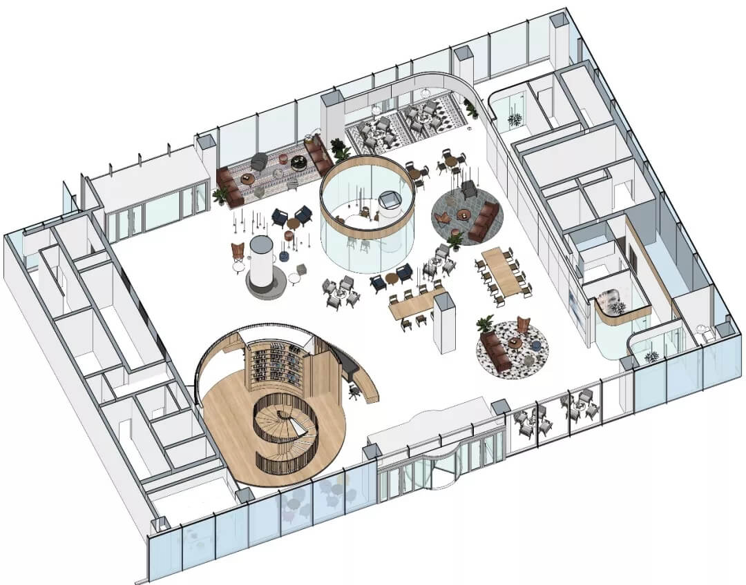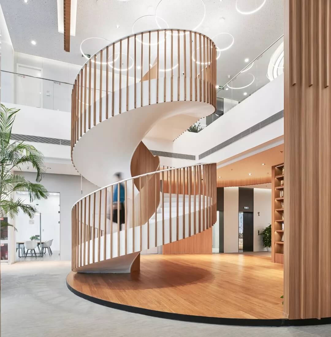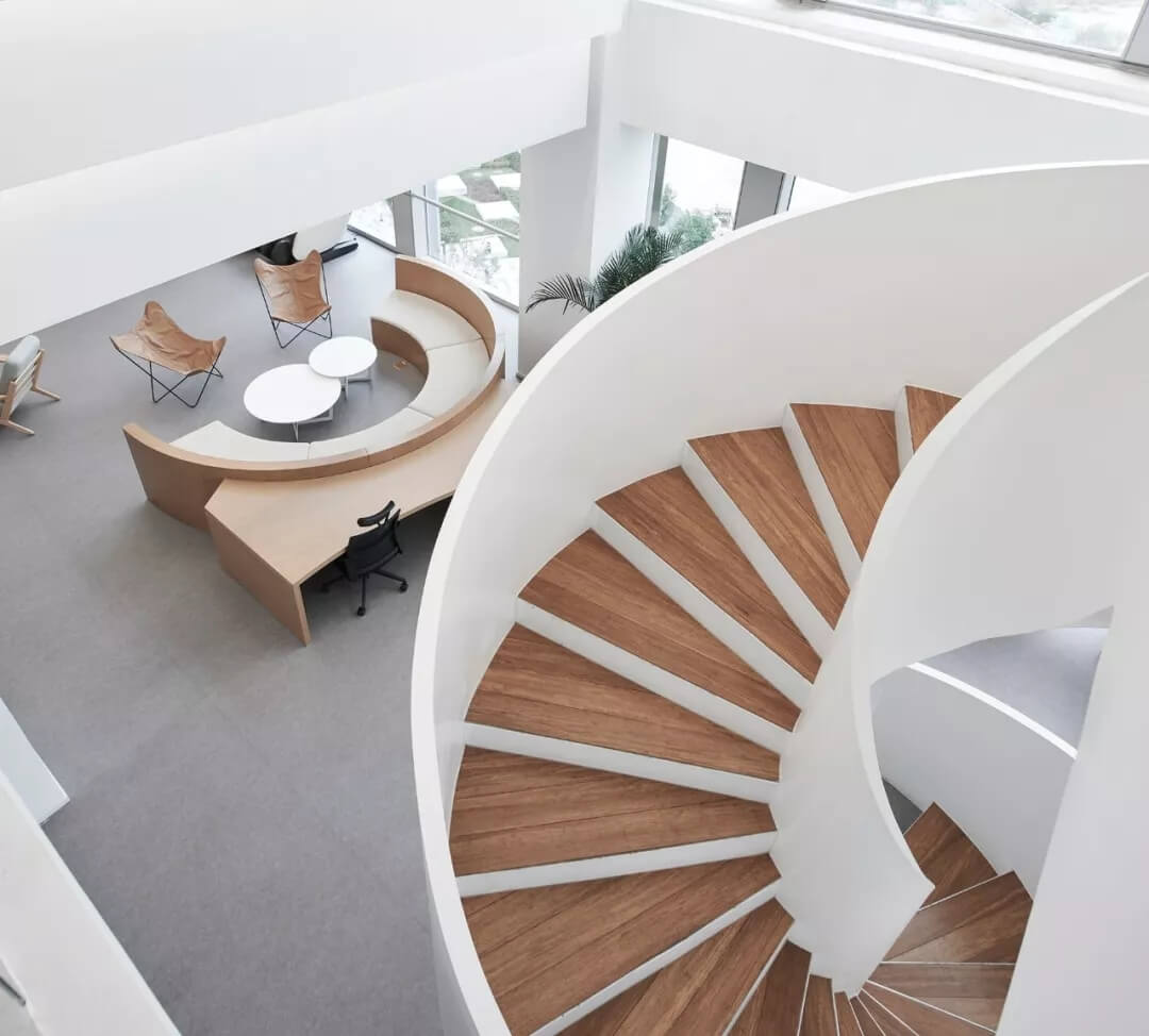 都市客廳島,選擇流暢線條的螺旋樓梯貫穿上下,運用條形面板錯縫排列成弧形的照明方式,使整個空間照度均勻,且條形面板亦可作為裝飾展示面。家居軟裝選用極簡風格,流線組擺方式,營造自由靈活的空間,促進員工間的交流和溝通。