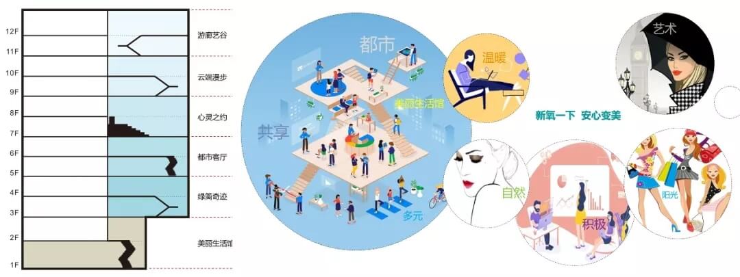 在此理念和品牌屬性的影響下,艾迪爾設(shè)計師布局辦公和診療空間,傳達出“舒適溫暖,積極自信,時尚藝術(shù),活力陽光”的氛圍。因此在大廳布局“美麗生活館”,建筑南側(cè)每兩層設(shè)計成不同主題的公共空間。