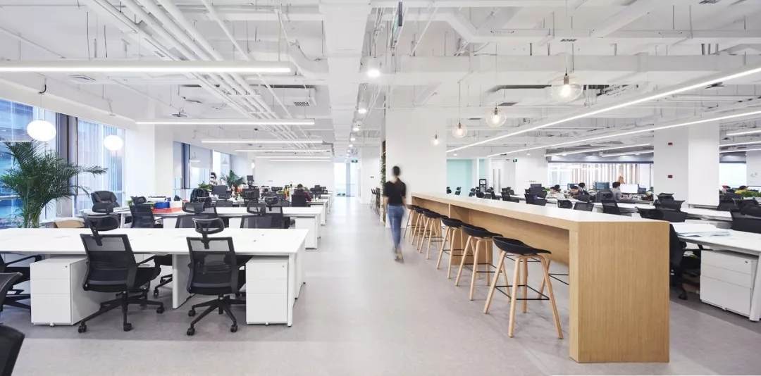 設(shè)計師在開放式的辦公區(qū)域設(shè)置長條吧臺桌,供員工自由討論辦公,午間用餐等,同時開放辦公區(qū)與南側(cè)公共島空間相連,員工可攜帶筆記本在這里沐浴著陽光辦公,討論,商務洽談,休憩等。