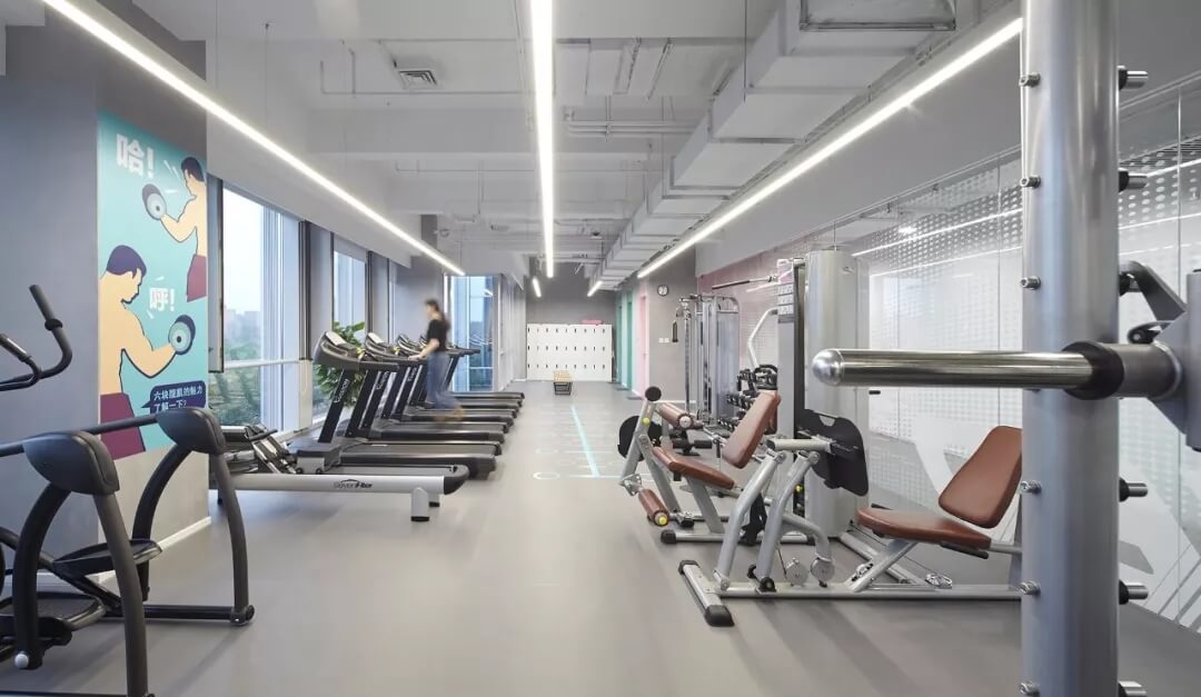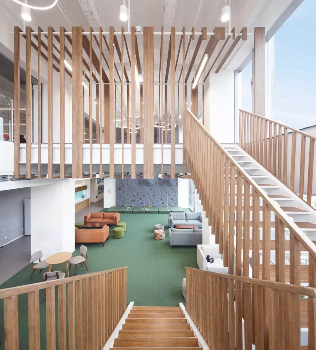 綠籬奇跡島,是自然,健康運動,挑戰(zhàn)自我的主題公共空間。木質(zhì)格柵樓梯在二層延伸出一個通透的格柵BOX,形成豐富的空間層次和視覺高差。同時設(shè)置攀巖墻,瑜伽室和健身房,展現(xiàn)新氧人不懼挑戰(zhàn),運動健康的生活方式。
