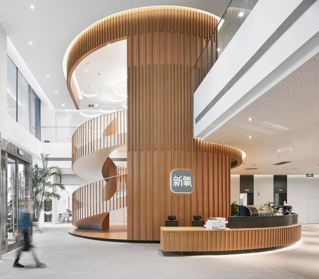 美麗生活館中最矚目的是兩個圓柱體空間模塊,一個是貫穿1-2層的木格柵旋轉(zhuǎn)樓梯,半開半包,與咖啡館及接待臺合嵌為一體,溫馨,時尚,樓梯的內(nèi)側(cè)展示新氧的榮譽勛章;一個是透明的柱狀空間,以靜態(tài)裝置的方式展示新氧文化,周圍布置洽談交流座椅;大堂南側(cè)用文化墻隔出開放的休閑洽談區(qū)和面試及收發(fā)室的圍合空間。