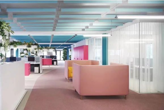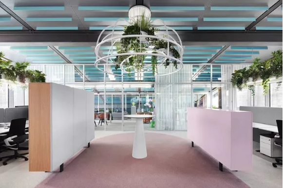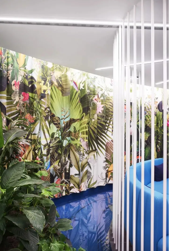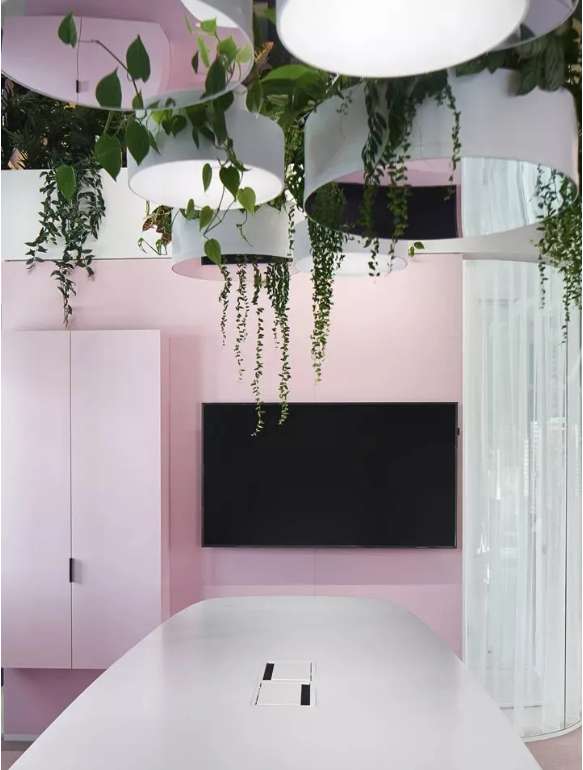 工作區(qū)采用中性色設(shè)計(jì),利于專注工作。淡粉色的走道是真正的情緒助推器,它喚起了員工之間的情感共鳴。精心布置的水源和雅致的燈光設(shè)計(jì)有助于帶來(lái)更愉悅的心情。熱帶壁紙與柔軟的沙發(fā)和小圓桌塑造了一個(gè)熱情洋溢的活力氛圍。