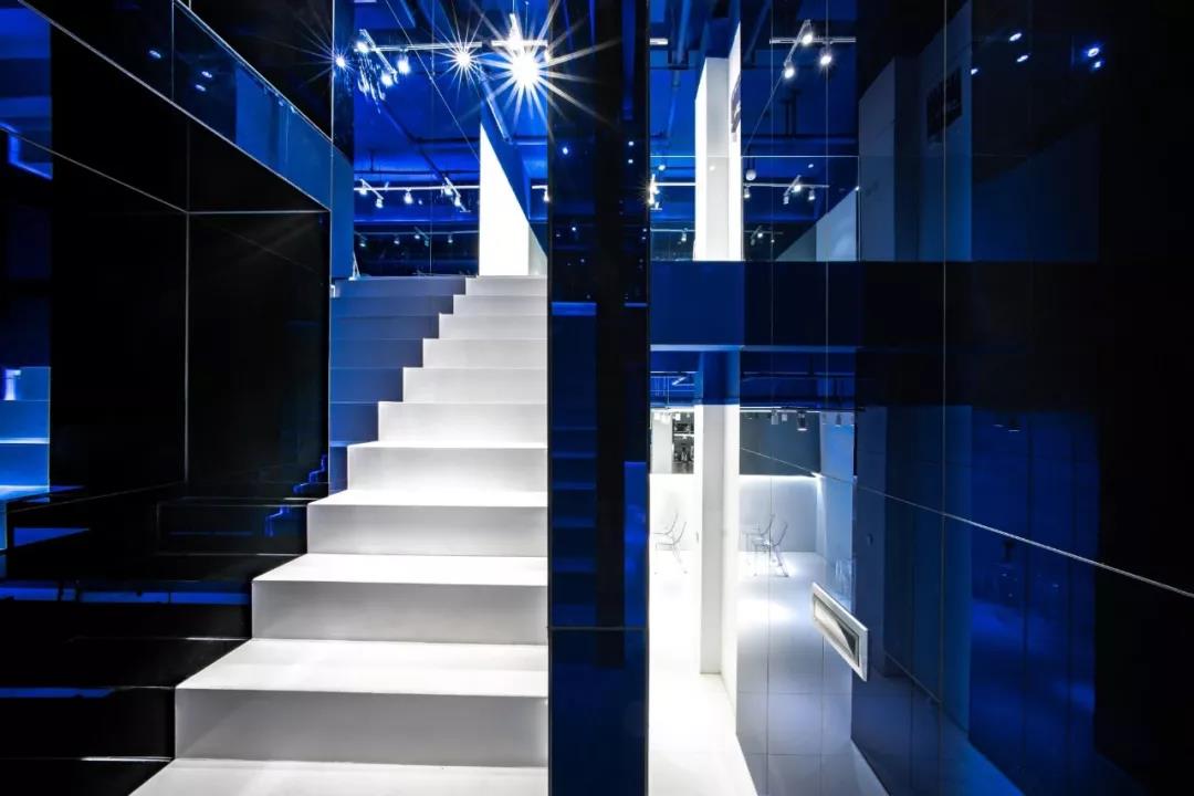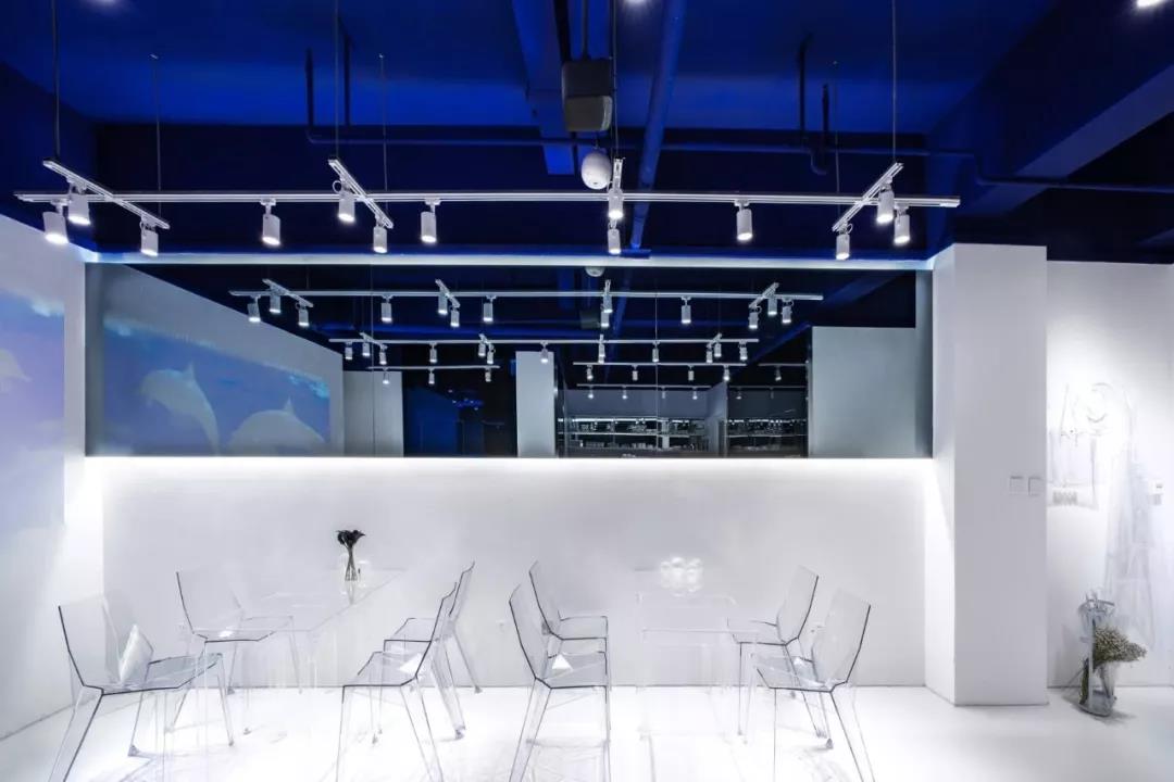 帶著這樣的邏輯,整個空間的設(shè)計就很明確了,拆除原有的吊頂,用涂料做成藍色的“天空”;下面的空間則使用帶有反射性/透明性的材料——鏡面、金屬、亞克力、塑料等,通過這種曖昧的委婉的,而非簡單粗暴的方式,讓深海的藍色充滿整個空間。