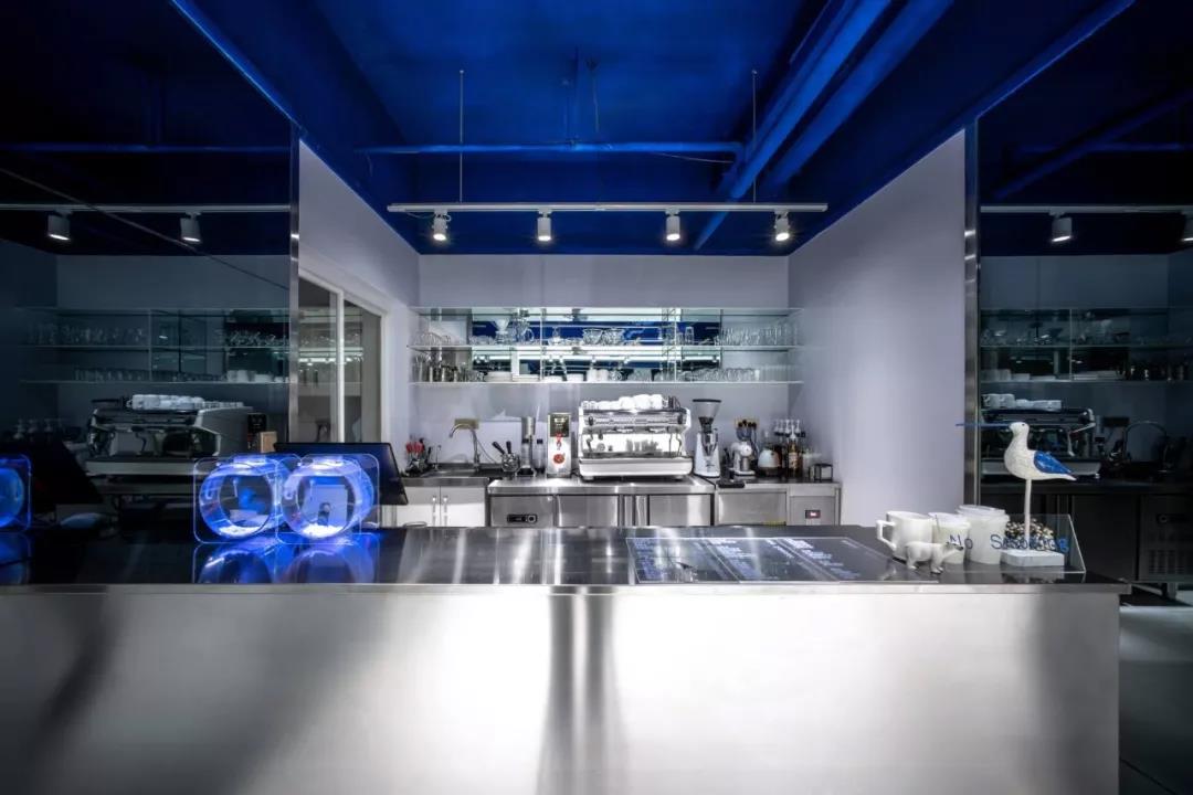 因為業(yè)主確定咖啡館名字叫“深海”,所以設(shè)計師花了心思去思考到底“深海”是什么。不同于常規(guī)的思考和正常做設(shè)計時搜索參考圖片的是,往往這樣的設(shè)計都是帶有藍色的空間,但“深海”這個名稱所帶來的概念思考卻是,為什么深海是藍色的?當透過這層思考方式去搜索就會發(fā)現(xiàn),海水之所以是藍色,是因為天空是藍色的(原理就不多說了),水體(空間)是透明的,所以深海的藍色是光和材料本身所產(chǎn)生的而非通過“設(shè)計”創(chuàng)造的。