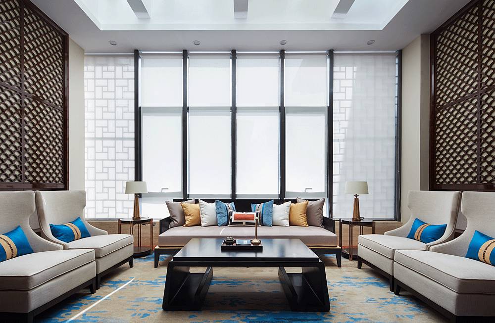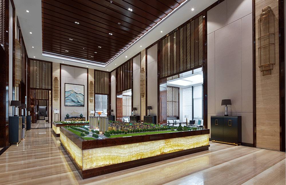 沙盤區(qū)采用簡(jiǎn)單、大氣的設(shè)計(jì)手法,沒有濃墨重彩的奢華場(chǎng)景,更多的是將歷史古都的韻味帶到細(xì)節(jié)中,如格柵、窗欞、黛青色擺件、意境掛畫等東方元素都透露著古韻,并融入大理石、玻璃、燈帶等現(xiàn)代材料,在營(yíng)造意境的同時(shí)兼顧場(chǎng)所的使用功能。