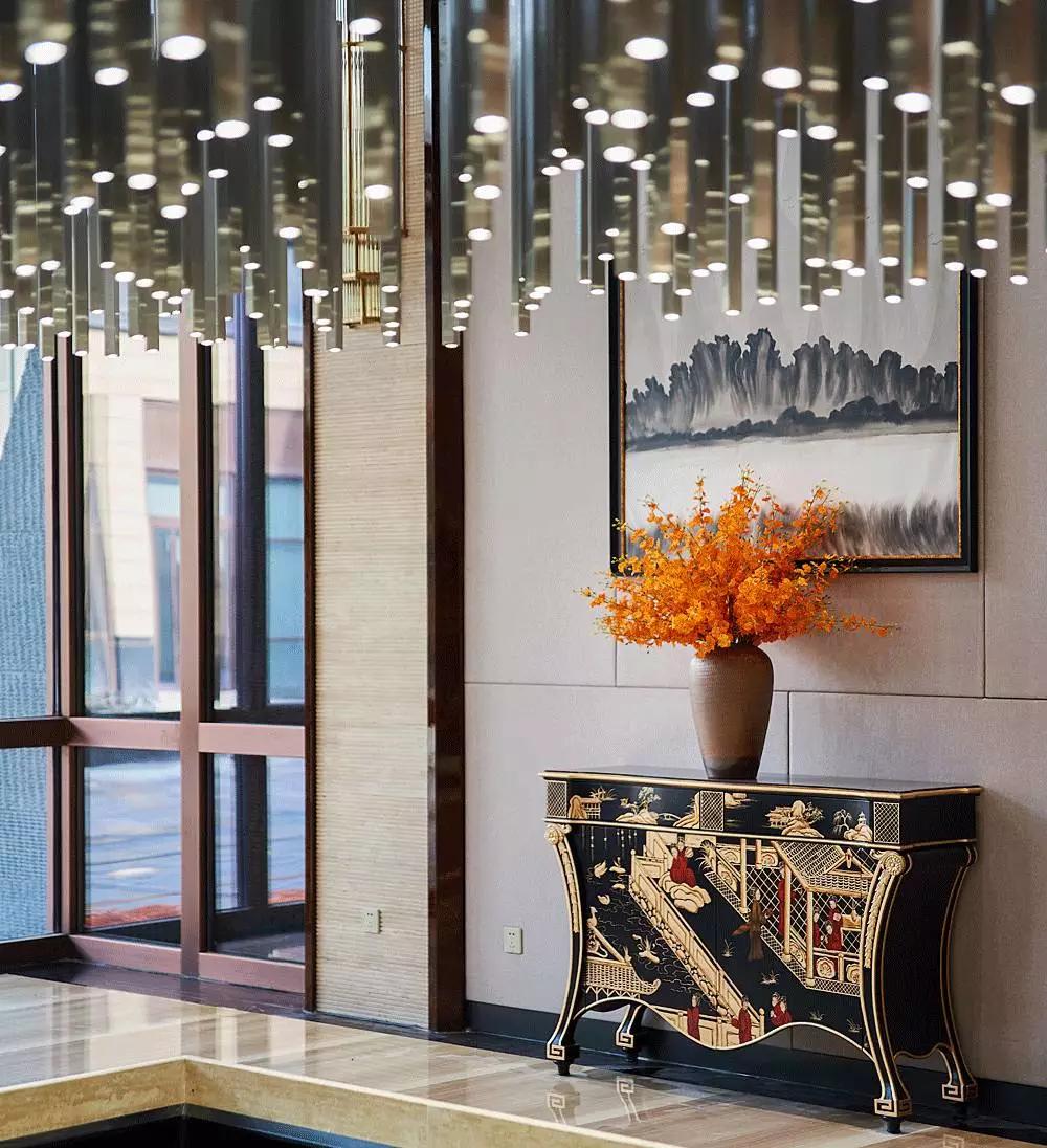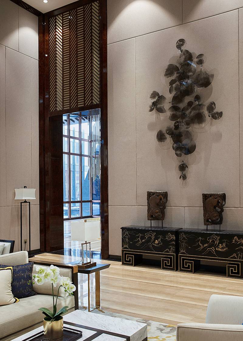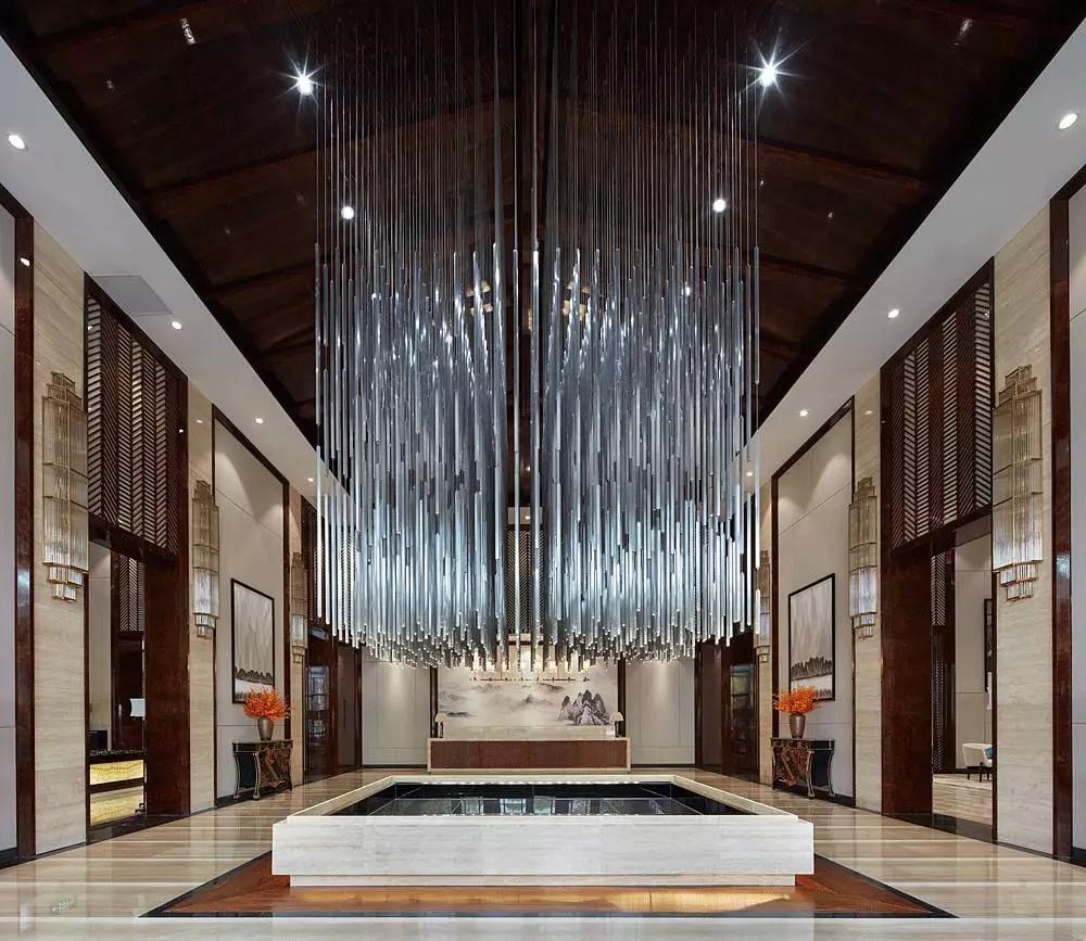 進(jìn)入大堂中心,便被一個(gè)奪人眼目的裝置藝術(shù)吸引,數(shù)百根不銹鋼條垂吊而下,宛如瀑布“飛流直下三千尺,疑是銀河落九天”,成為整個(gè)空間的視覺焦點(diǎn),啟動(dòng)后,水珠從不銹鋼滴落到地景的水中,呈現(xiàn)出“大珠小珠落玉盤”的動(dòng)感。