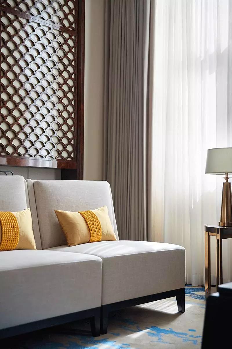VIP區(qū)域以雅致的米白色和簡(jiǎn)化的線條打底,奠定空間的基調(diào),為提升舒適度,沙發(fā)椅選擇造型簡(jiǎn)約的現(xiàn)代款型,通過線條的弧度拿捏出中式的味道。
