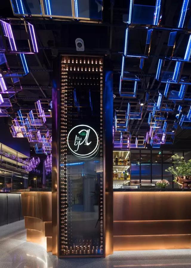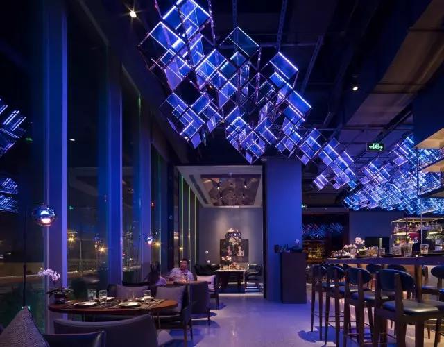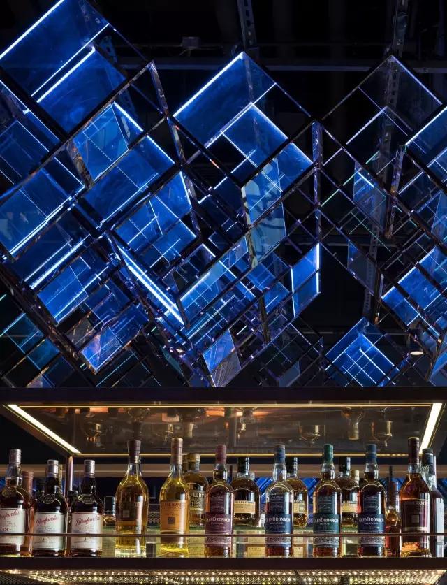 attabj意大利餐廳最美之處便是天頂上的藝術燈群,設計師通過抽象化、藝術化的手法,將這一感官體驗濃縮為空間當中的一組裝置,透明亞克力單元體如同酒杯內(nèi)的冰塊,而不斷變幻的LED燈光就像是色彩斑斕的酒體,兩者相互反應形成夢幻迷離的光影效果。