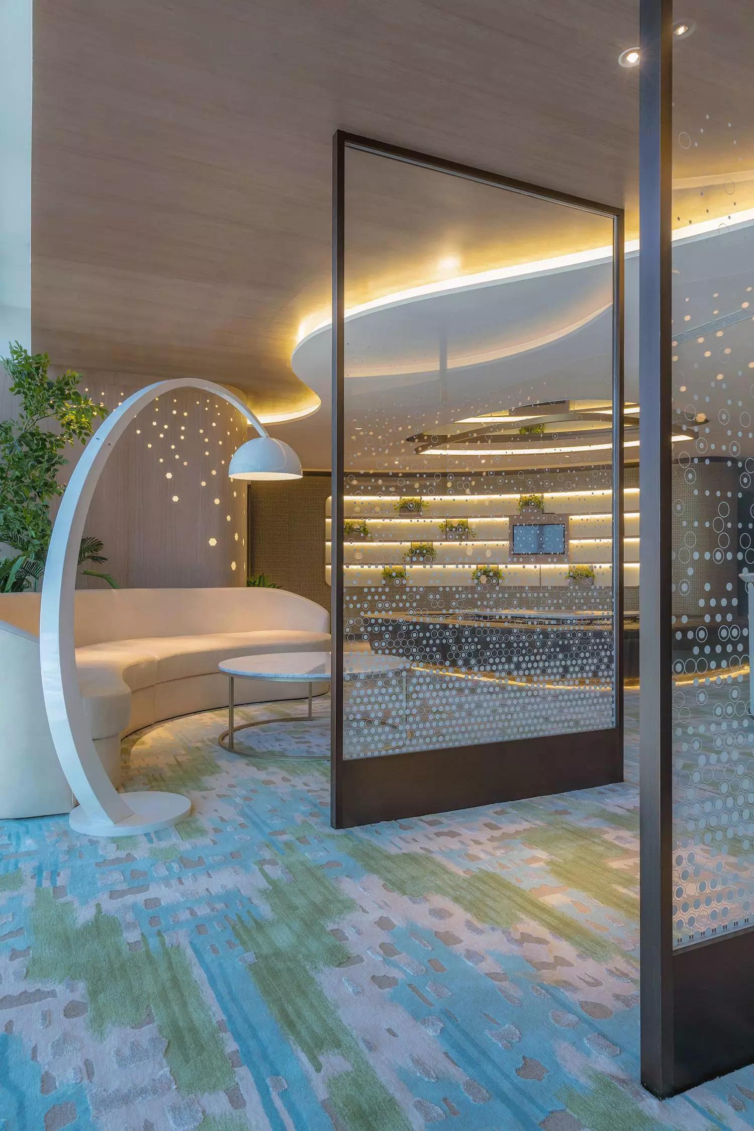 蜂窩形狀滲進天花至墻身的燈箱以及屏風,體現(xiàn)出大自然的親和力讓人心沈靜,宛若森林小徑,葉縫間穿過而灑落的陽光,體現(xiàn)日本韻文中的「Komorebi」靜謐而悠閑涵蘊希望。